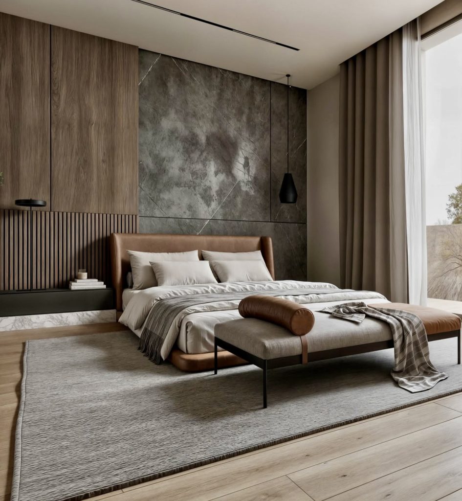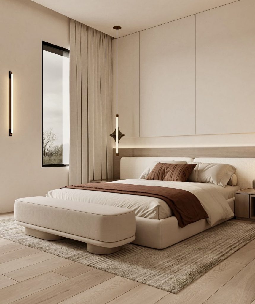 This modern luxury bedroom highlights the importance of statement lighting in creating atmosphere. A sculptural pendant drops elegantly above the bed, paired with sleek vertical wall fixtures. The low platform bed, creamy upholstered bench, and tonal rug keep the look clean, while the chocolate throw and pillows ground the palette with a moody note. The result is a serene yet classy space that feels hotel-worthy. If you’re searching for vanity ideas or wardrobe design to match such interiors, keep furniture streamlined and integrate hidden storage for an uncluttered finish. This interior strikes the perfect chord between high-end design and everyday functionality.