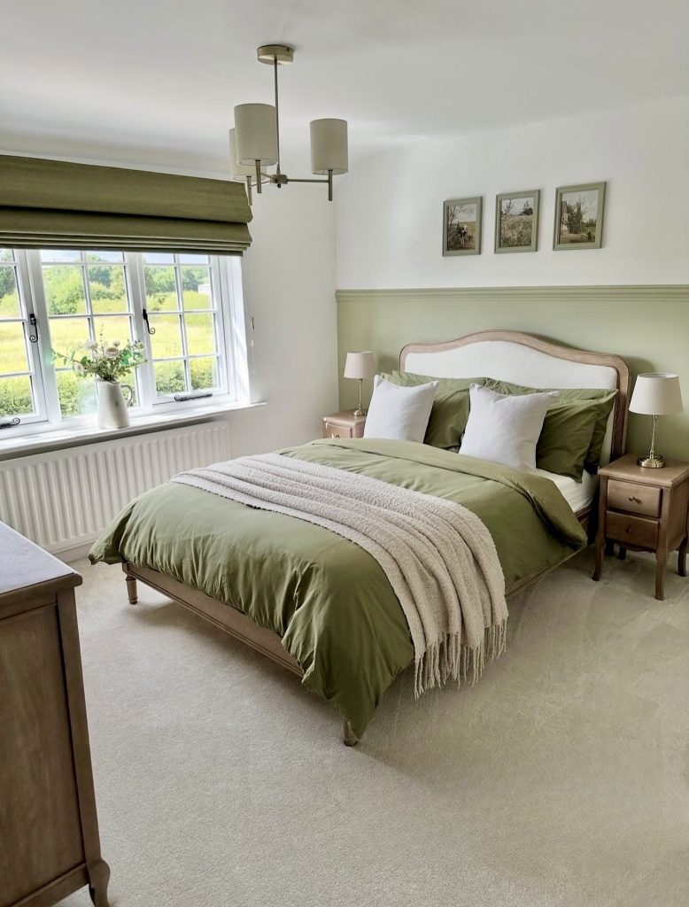This room brings nature indoors with sage green walls and bedding—a tone crowned as one of 2026’s most soothing shades in interior trends. Its mix of coastal charm and English countryside elegance makes it ideal for anyone craving earthy decor ideas. Layer soft neutrals, wooden accents, and gentle textures to recreate this timelessly cozy and rejuvenating look in your own home.