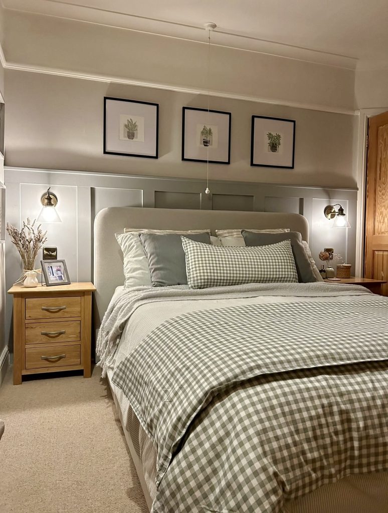 This bedroom takes a timeless approach with its soft gingham bedding and paneled accent wall. The muted tones, paired with framed botanical prints, bring a gentle aesthetic that feels both homey and polished. Small details like brass sconces and a wooden nightstand add warmth, making this a perfect source of inspiration for anyone craving cozy yet practical room ideas. The design is very welcoming, perfect for suburban homes, where comfort meets elegant simplicity. The combination of patterned bedding and simple wall decor is also an interesting way to add that aesthetic to small room decor ideas without making it look too bold.