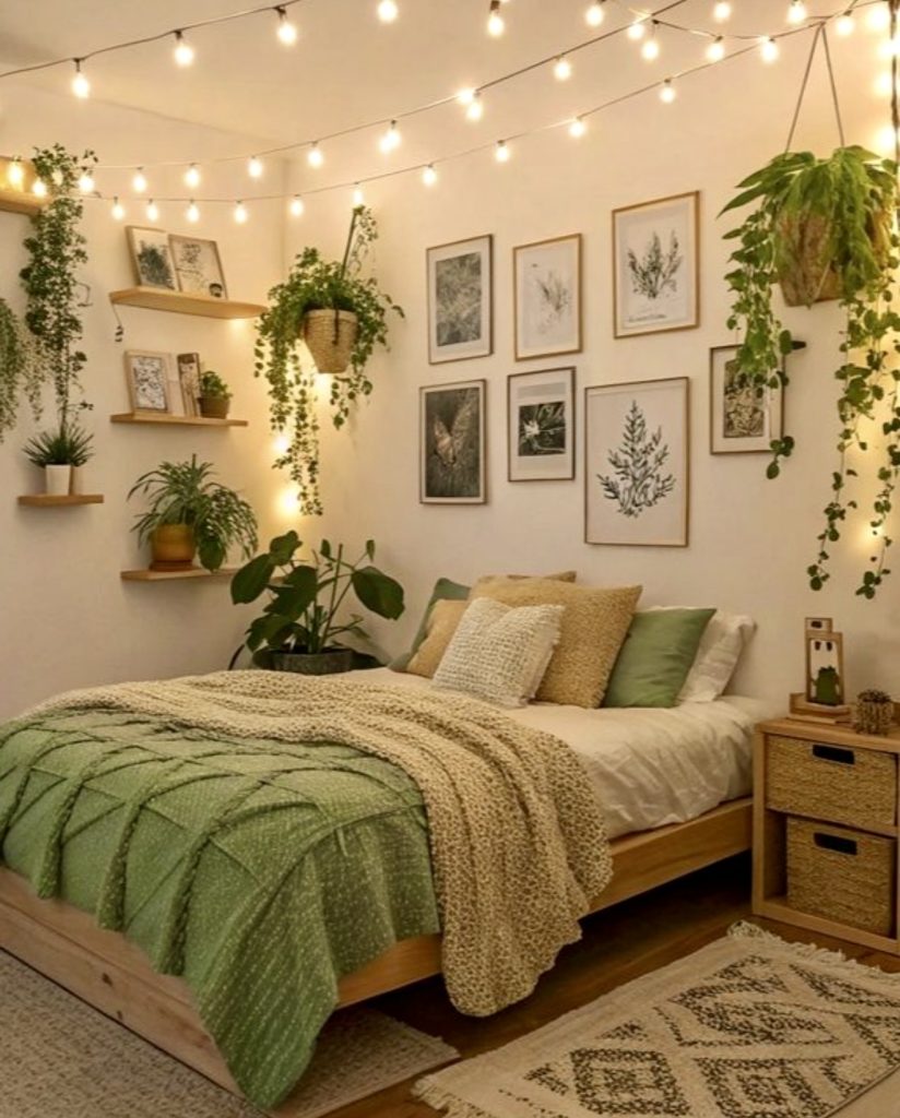 This warm and inviting bedroom displays how green accents breathe life into an otherwise neutral modern boho space. Plants cascade from shelves and corners to give a sudden rush of freshness, whereas woven baskets and warm-toned timber keep the look grounded in earth textures. To complement these lurid greens are subtle fairy lights and multilayered textiles, which add an intimate charm. This style suits anyone who craves a clean and structured bedroom with almost all the warmth and soul of boho style. It clearly suggests how a few carefully thought-out natural accents can drastically change the ambience of a space.