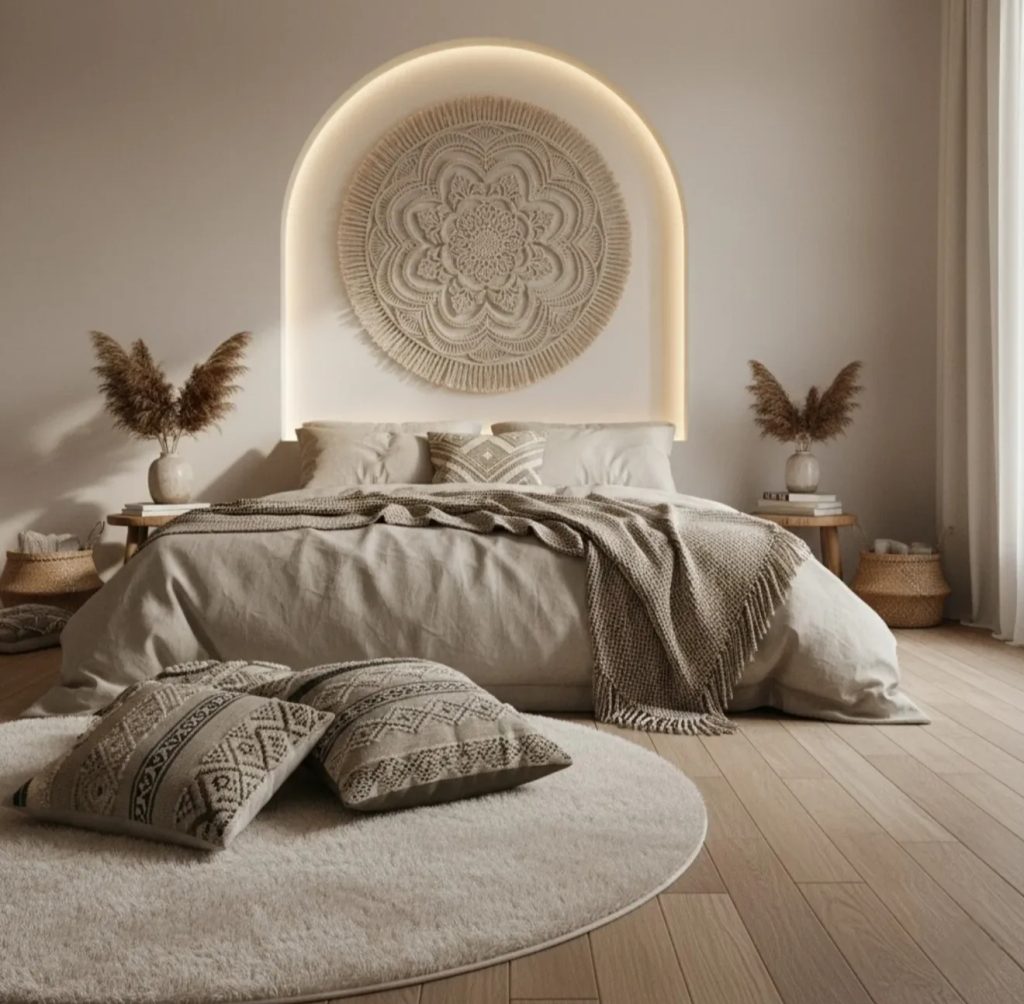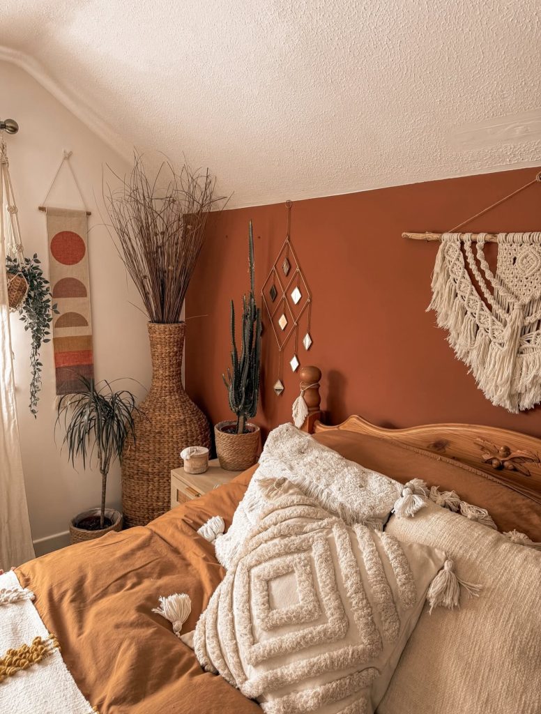 The emphasis here is on warm terracotta walls, neutral textiles, and brash boho accents. Chunky, throw pillows, macramé wall art, and woven works lend the space that warm feeling of under-the-breath colors. There is almost a little vintage spin here-too much of a proof that boho design in 2026 continues to grow by mixing old and new, soft and hard, into one harmonious look.