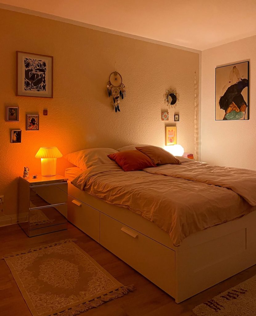 Dark moody lighting sets the scene here in a way that instantly feels cozy. Amber lamp glow sees softer sands neuters casually layered minimal bedding. Another thing that keeps it very in keeping with its boho decor are the wall affairs: dreamcatcher, eclectic artwork, and subtle textile layering through pillows. This gives you a framework on how modern and intimate can come into fruition without bright colors – perfect for anyone that loves a minimalist palette but wants that gathered, soulful feel. Interior experts often urge experimenting with light temperature to shift mood, and here, that golden glow takes what could have been a simple setup and turns it into a boho haven.