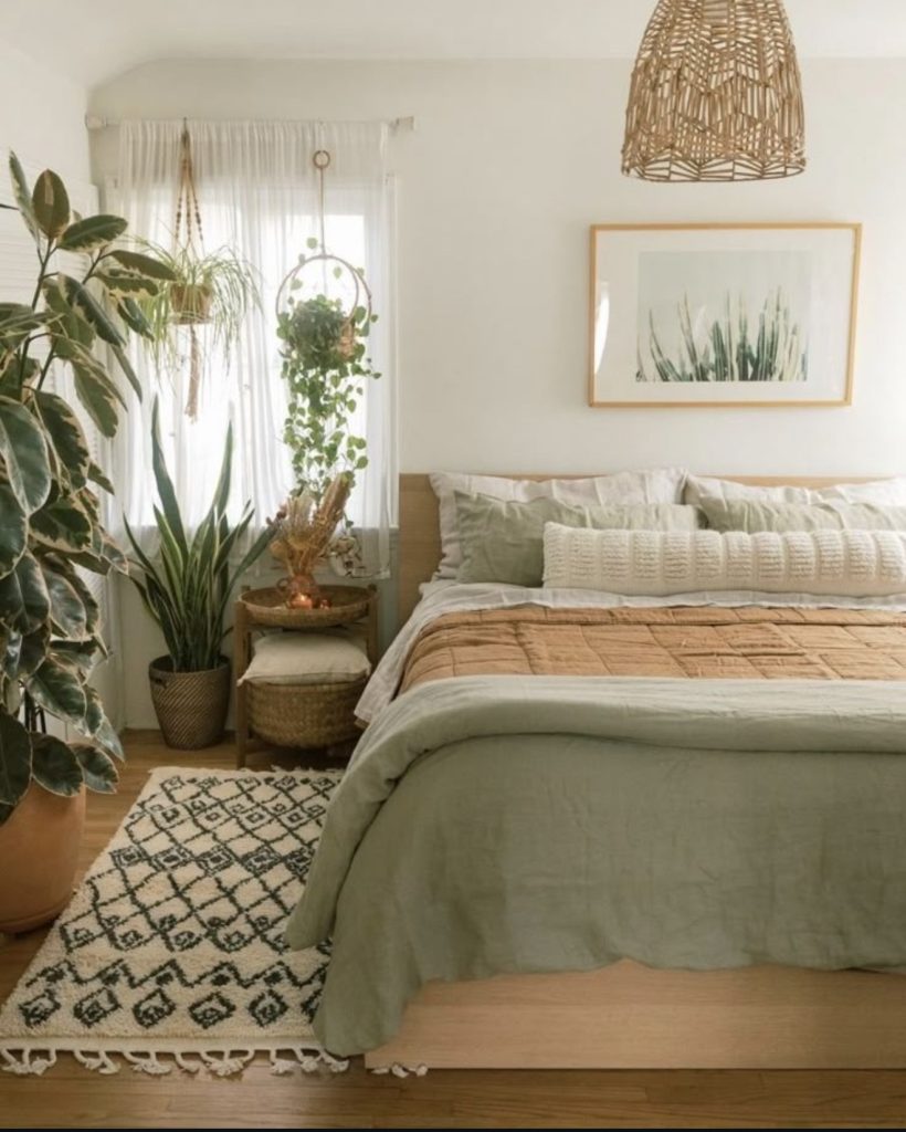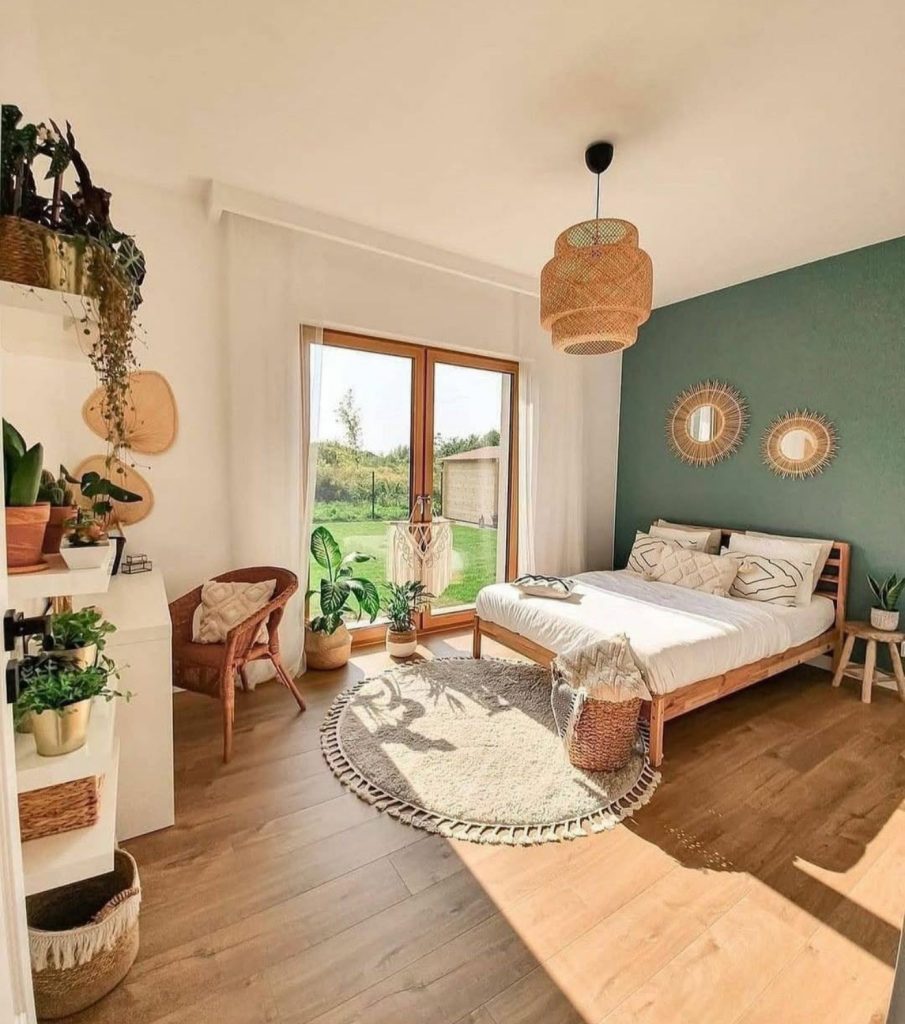This thoughtful accent wall, in sage green, licking an earthy calmness into the mix. Combine this with a lot of houseplants plus some woven textures, and this boho bedroom tends toward that coastal and beachy vibe; meanwhile, an oddly-shaped circular rug from somewhere far away shores the softness with a visual anchor right under the bed. Throw in a little bit of natural wood furniture, and back comes that wonderful feeling of freshness, tied in with beams of light blue daylight. Designers such as Justina Blakeney have been champions of plants in boho skins-and not just for aesthetic but for nurturing. This space thus shows that even the most modern home with large windows will feel soulful when layered with greenery and handmade.