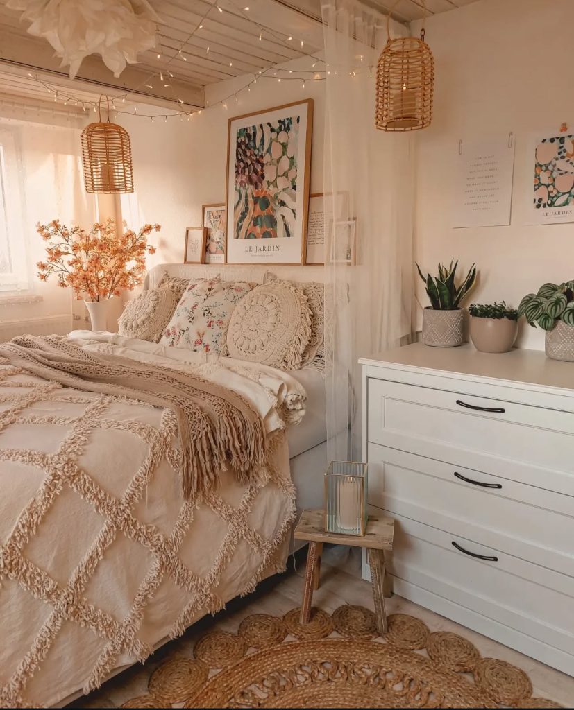 The golden glow bathing this bedroom proves just how much warm light has become one of the strongest boho bedroom inspirations in 2026. Fairy lights, rattan lamps, and natural woven décor conspire to create an aura of coziness much more than design. The textured bedding, with macramé and crochet pillows, indulges in vintage romanticism while the muted florals on the wall art keep it colorful in a subtle way. For any couch potato who loves burying themselves in a good book, it serves as a reminder that design is not just what one sees, but how one feels about inhabiting the space.