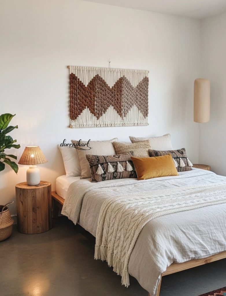 Layered eclecticism comes to life in this bedroom. A tapestry of woven geometric patterns sets the tone from a very western and artist side into the boho mix. Neutral colored linen bedding is jazzed up with tassel cushions, velvet accent pillows in rich mustard, and a chunky knit throw. The look flirts with modern restraint and Afro-inspired patterning-they together tell how global design stories enrich spaces. Boho world heavyweights in the designers’ arena will often urge investing in handcrafted pieces that have a story-this space absolutely demonstrates why. Every single texture screams unpretentious, lived-in luxury that is distinctly unique to its owner.