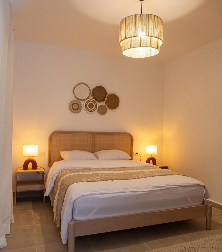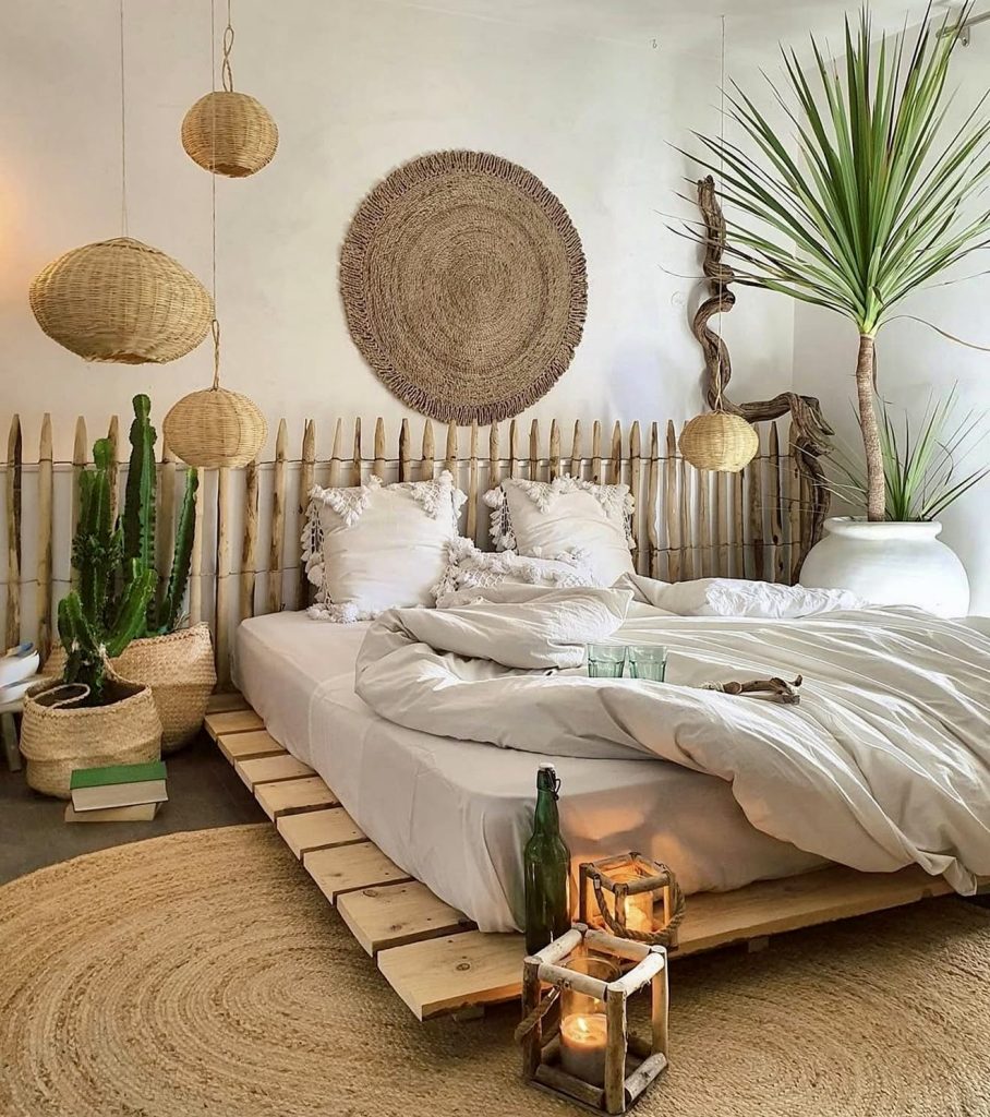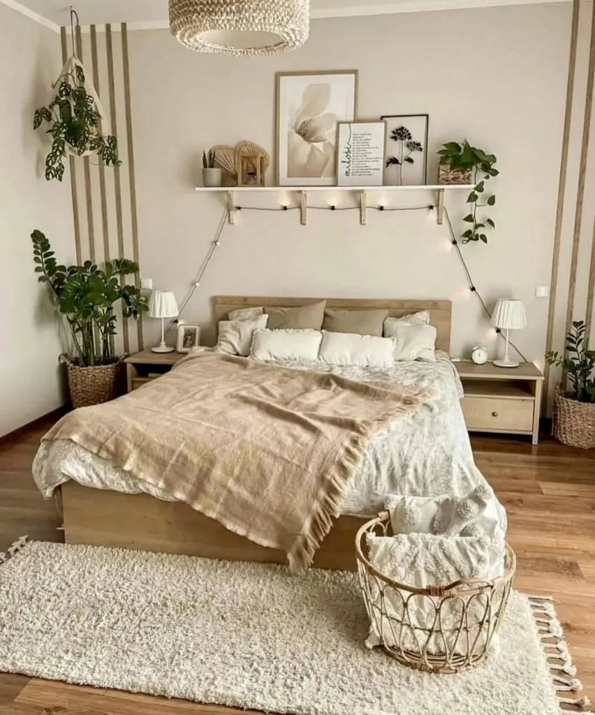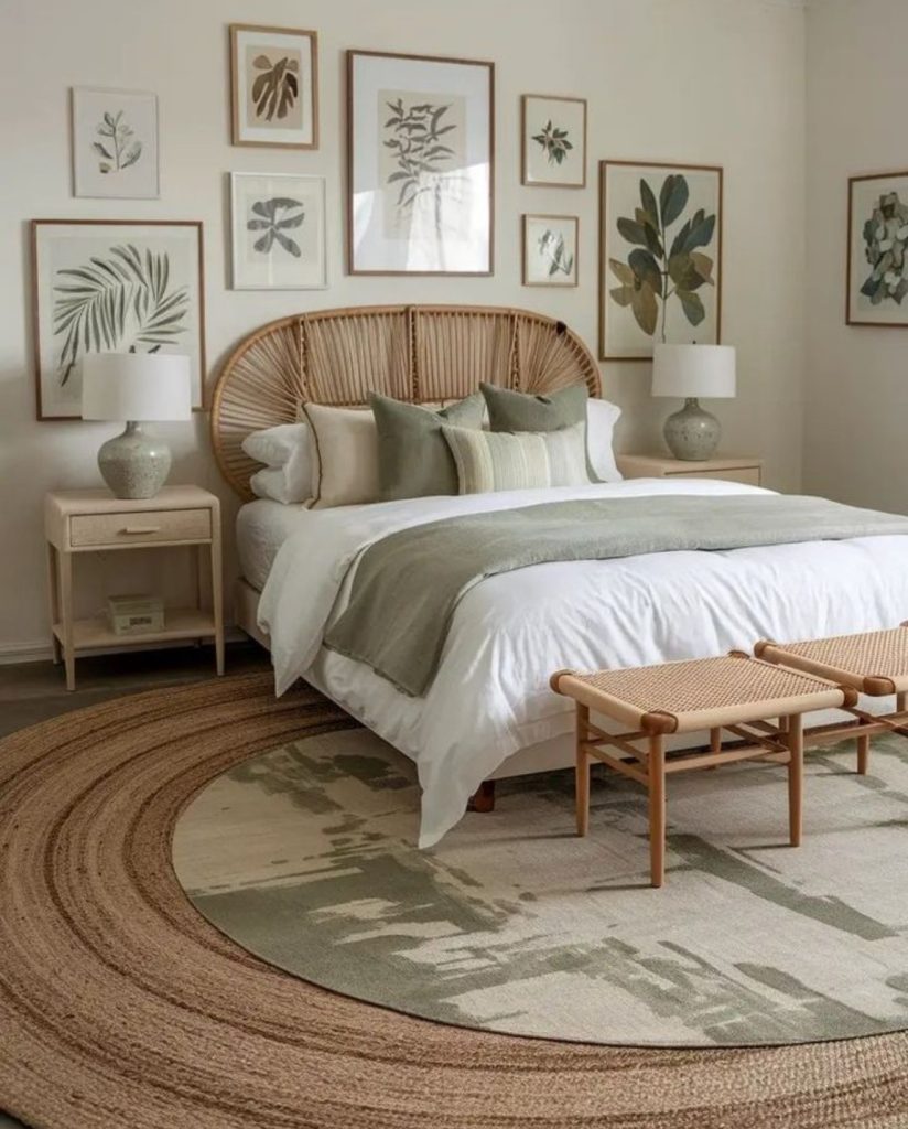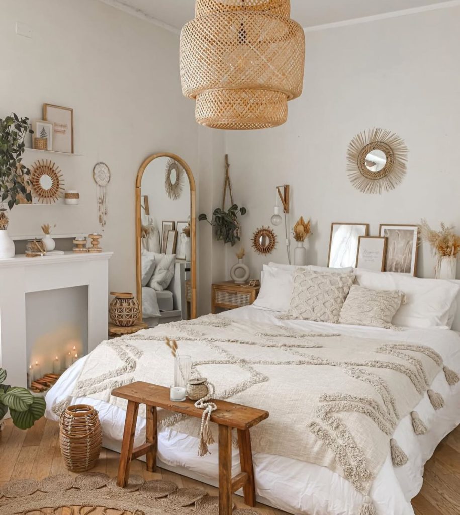 This tranquil boho bedroom enjoys the modern simplicity of warm woven textures that reference coastal design. A neutral palette anchored in hues of beige or sand grounds the atmosphere in a calming spell, made for a relaxing ambiance. Soft texture is offered by rattan for the headboard and lamps, whereas the wall décor of layered baskets gives artisanal charm without overpowering the space. This vibe explains that boho style need not be maximalist; it can swing toward minimalist luxury, where each detail is set with purpose and harmony. It is ideal for those yearning for a beachy vibe with a clean and uncluttered touch.