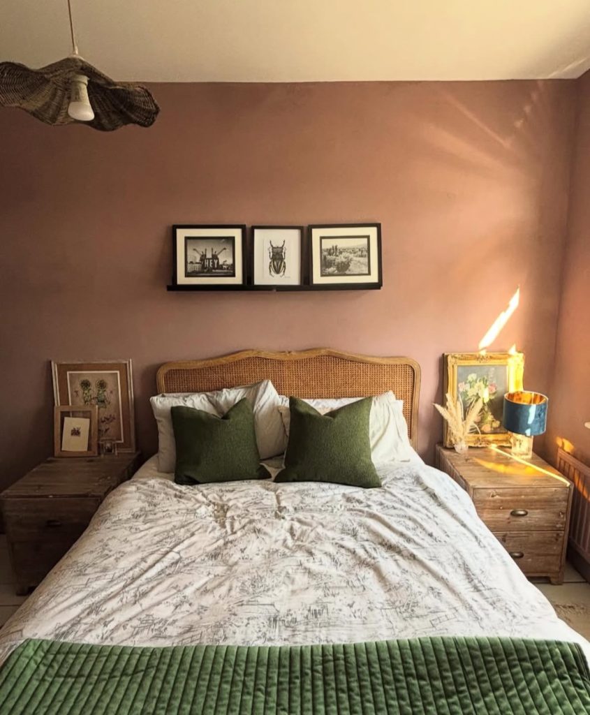 Muted mauve walls set a soft, moody backdrop in this bedroom, while the green pillows and quilted throw inject a grounding, natural touch. The woven headboard and timber nightstands keep it earthy, while the curated art above the bed throws in a pinpoint of character. This room effortlessly tugs between vintage personality and modern restraint, suggesting how color can subtly drive a mood. Sage and deep green tones will trend into 2026, usually by resorting to them to pull a little bit of outdoors into the interiors-paradise for coffining a chill yet stylish vibe without imposing too much on the senses.