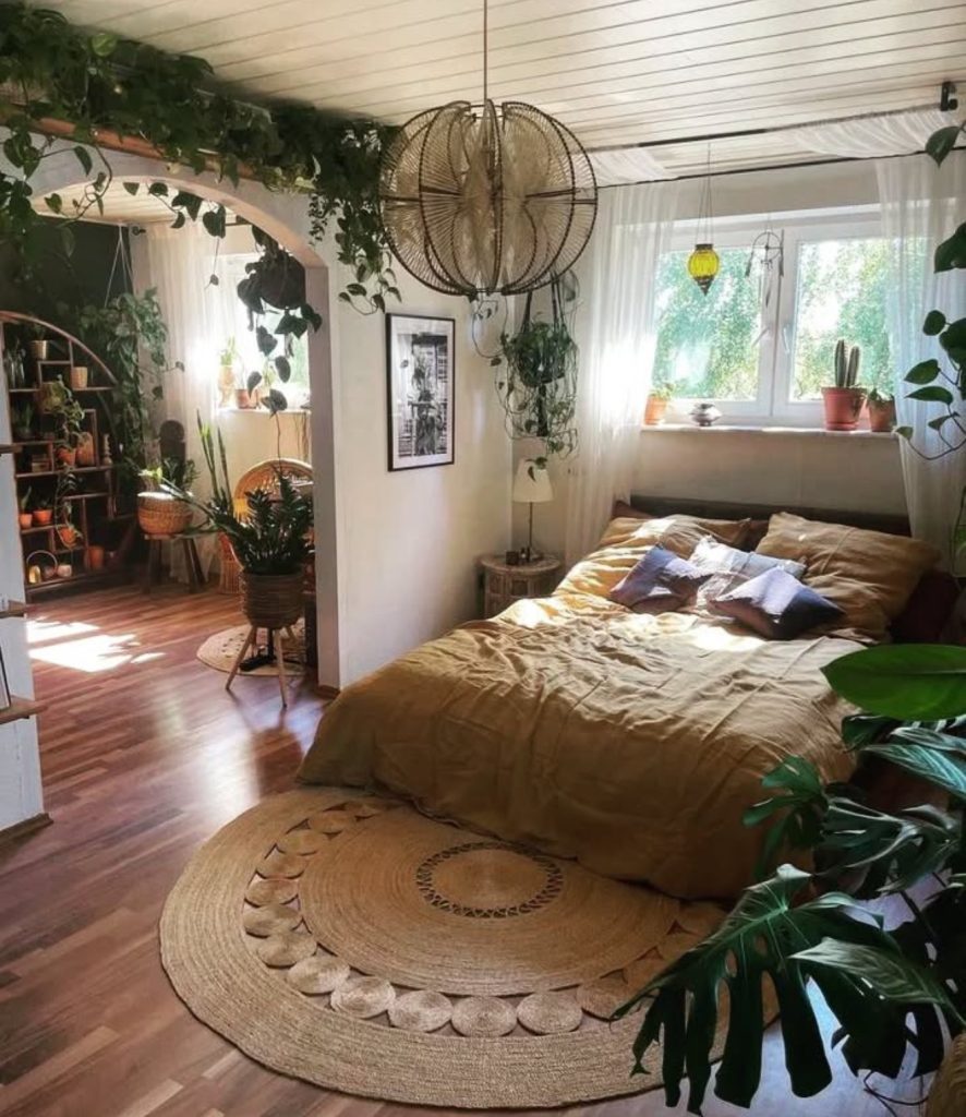 Cascading plants frame the room where this bedroom represents the greener, nature-filled end of boho design. The soft golden bedding supports the heat, while the round jute rug anchors the room in texture. Hanging light fixtures and macramé details bring a laid-back beachy vibe in, while the layered plants bring on the dreamy greenhouse feel. Biophilic design, integrating nature indoors and enhancing well-being, is increasingly highlighted within the industry, and this is a classic example. It is an earthy, cozy retreat that feels alive and personal-an excellent choice for those who want a bedroom as a serene escape.