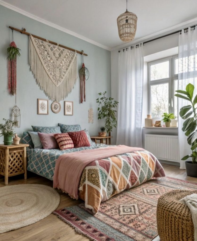 This is boho at its most eclectic and colorful manner. A bright textile hangs over the bed and instantly sets in a vintage global tone, reminiscent of markets in Marrakech or Istanbul. Bold layering of patterned rugs, throws, and pillows in warm reds with oranges and an accent of blue set up a highly visual environment. The woven pendant lights and wall hanging introduce texture, and the greenery softens the edges. This design embraces a maximalist storytelling where every single thing contributes depth and personality. An invitation to curate rather than decorate, for homeowners who love to travel with Afro and artisanal influences.
