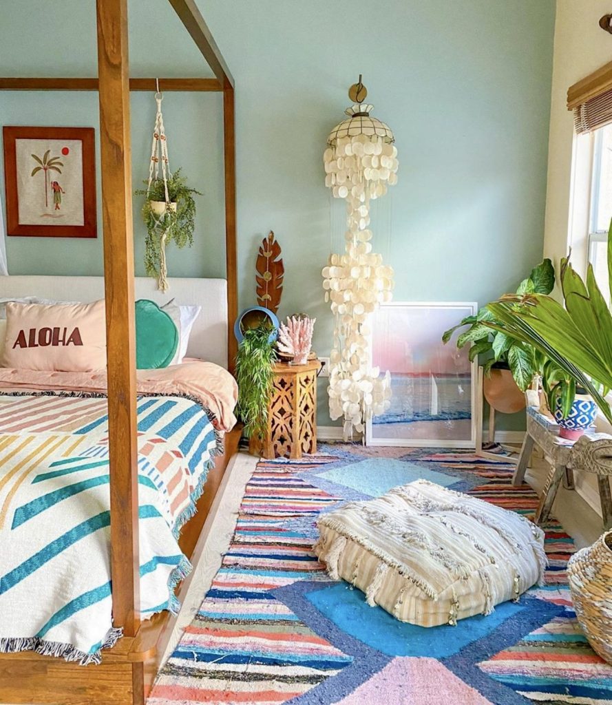 This vibrant bedroom skids excitement from every inch on the floor of beachfront coastal energy that highlights boho design with wild color and different textures. The light blue walls provide a breezy backdrop while the rug and throw present fabulously colored geometric shapes reminiscent of surf towns and summer retreats. Hanging plants, natural wood furnishings, and lighting inspired by shells transform each texture into sender-life layers. This is a great example of how modern boho interiors of 2026 embrace joy through color-all while staying in perfect harmony. This design gets all the endless-summer vibes down for anyone who is longing for it.