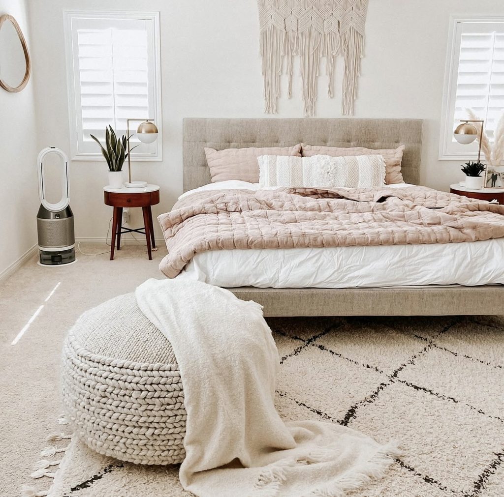 With clean lines and a warm blush palette, this bedroom exudes the modern-minimalist-boho feel. The pink hues in the bedding soften the space, while the macramé wall hanging above the bed adds extra texture and character. The chunky knit pouf and soft area rug further urge warm feelings, declaring that boho doesn’t always have to be loud and in-your-face. Such looks adapt well to suburban homes or apartments wherein you want laid back with some personality. Many interior designers say that neutral spaces created through a single accent color only get better with time, making this a great example.