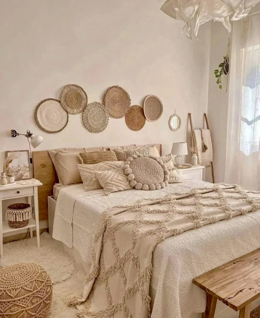 A collection of woven wall baskets here complements vintage craftsmanship with modern layering technique, becoming a striking focal point for the room. Somewhat creamy neutrals and those textured beddings set up a luxury-meets-handmade feel for this room, while the mixed materials keep it cozy. The styling is very intentional, with nothing feeling forced, which shows the essence of boho interiors—collected objects tell stories. This design is rooted in aesthetic harmony, allowing texture to take precedence, proving you need not knock the walls down with wild color schemes to make a big impact. It would be perfect for those who are into that quiet elegance with a global twist.