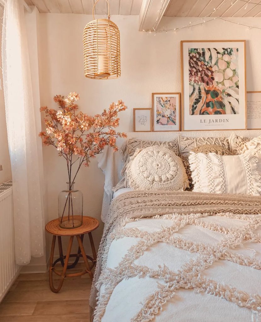 This dreamy setup integrates earthy textures with soft and romantic touchings. Layered throw blankets, tasseled pillows, and woven light fixtures exhibit an aesthetic of cozy. The framed artwork adds to its vintage charm while the delicate branch arrangement set in the corner introduces a subtle pink accent that feels modern yet timeless. Designers oftentimes speak about the ability of small natural elements, such as dried flowers or branches, to bring depth and dimension without clutter. This style is perfect for those drawn to a tenderly tactile interpretation of modern boho interiors.