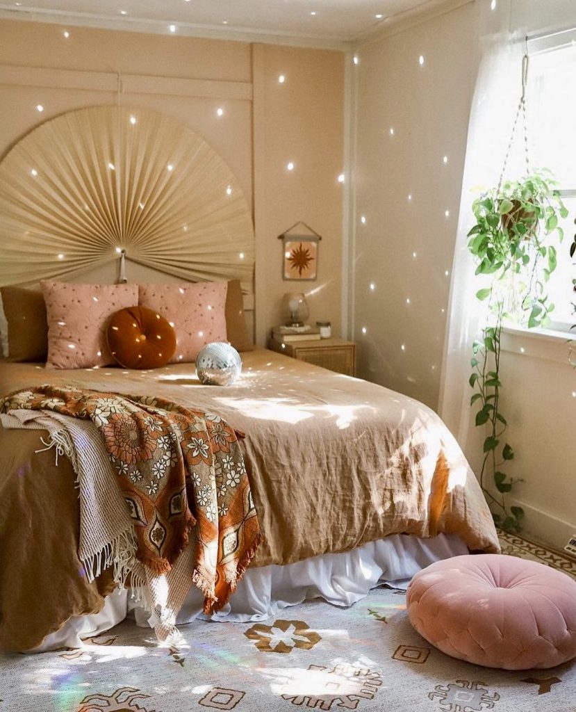 A splash of personality defines this sun-washed-in-color bedroom. The giant fan wall décor, pink velvet floor cushion, and warm brown bedding are layered against twinkling light reflections from a disco ball. This is boho with a playful twist-merging moody tones with joyful light. The hanging plant serves as a little slice of green grounding the whimsy. This look speaks to younger homeowners who want to have fun while being stylish, marrying a bunch of modern décor trends with a generous dose of retro cool.