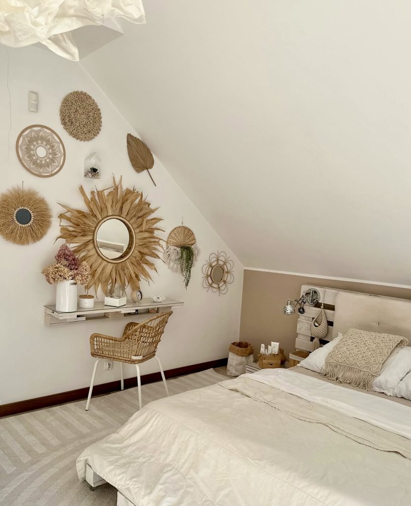 An angled ceiling bedroom that cleverly makes the most out of a tricky architectural space and turns it into a modern, textural retreat. A collection of woven mirrors, baskets, and organic wall décor establishes an earthy, aesthetic focal point without overpowering the room. The rattan chair and minimal palette keep it light, almost a statement of proving how boho also works great in minimalist settings. Interior pointers note that asymmetrical spaces gain from rounded, organic shapes-this one is a perfect demonstration of that, giving form to functionality with soft natural details.