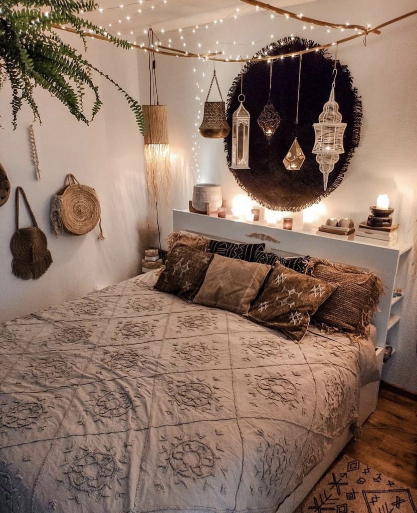 Hibernate under the dark, atmospheric elegance of this bedroom, with hanging lanterns, layered textiles, and string lights framing the space with a star-studded canopy. Deep browns, blacks, and earthy textures fill the space while setting the mood of intimacy, grounded yet enchanting. This stands as a vivacious example of how boho design doesn’t necessarily have to link with bright colors-it can prosper in shadows and warmth. The mix of lanterns and fairy lights offers a creative styling hack for anyone renting or working on a small-scale space who wants to achieve big-impact ambient lighting without doing a ton of renovations.