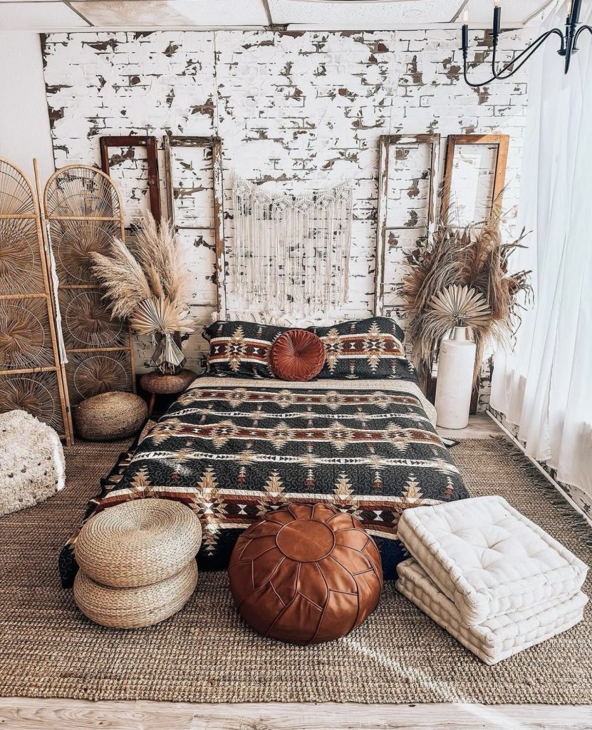 This space celebrates western and vintage influences with bold patterns, leather poufs, and pampas grass. The black-and-rust blanket makes a striking focal point, balanced by woven textures and layered textiles for that cozy, lived-in vibe. The distressed white brick wall adds a modern edge while still honoring the eclectic spirit of boho. This design proves that statement patterns can shine when surrounded by natural materials, making it perfect for those who love both rustic charm and contemporary styling.