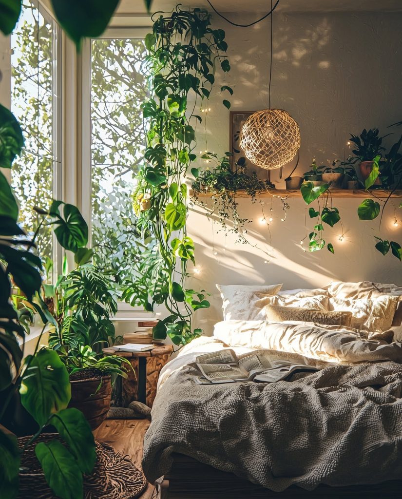 Lush greenery takes center stage here, making this bedroom feel like a secret indoor garden. The gently descending vines, mast-sized plants, and sun rays create a vibe that’s equal parts moody and uplifting. Layered in cream and neutral shades, the bedding magnifies the coziness, while the warm woven pendant injects a mellow glow once night falls. This speaks to contemporary Afro-inspired ethos celebrating life through nature, color, and texture. For anyone seeking an atmospheric and moody corner to relax in, this is it-if they’re about staying dimly connected with the outside world.