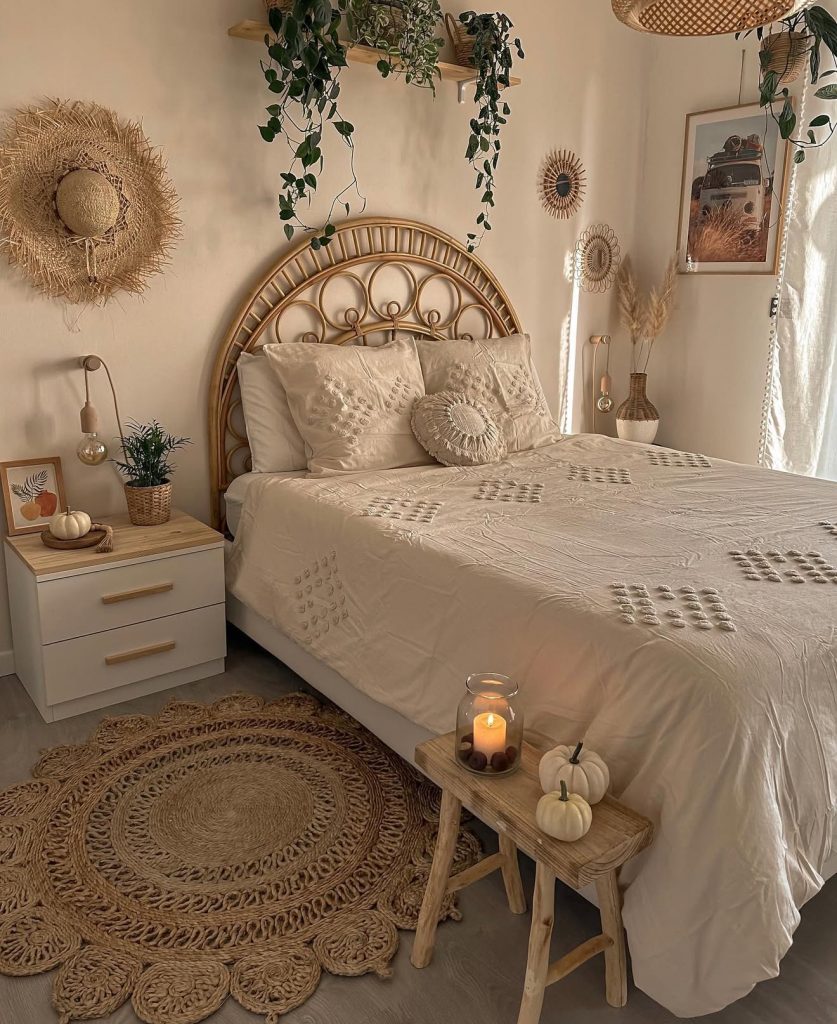 Showing that earthy neutrals build a space that is both contemporary and timeless is this design scheme. The carved rattan headboard stands as a natural focal point while the embroidered bedding soothes the tactile look. Layering of woven rugs, a wooden bench, and a hint of green from some plants provides dimension without overwhelming the serene aura. Lit by candlelight and garnished with seasonal peculiarities like mini pumpkins, this bedroom turns displays for a warm skin aesthetic kind of update anyone who desires without going easy over-the-top.