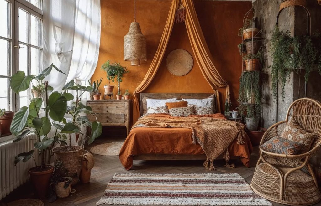 The room makes a statement, rendering the boho moodier and earthier. Deep terracotta walls, burnt orange bedding, and natural fibers meld into a Western-inspired yet global design. Large leafy plants soften the dark tones near the window while injecting fresh energy inside. The woven baskets, rustic woods, and a layered rug underline the eclectic charm of the room, and the canopy draped upon the bed adds a sense of drama. It is bold and unapologetic and perfect for anyone willing to give character to their personal sanctuary.