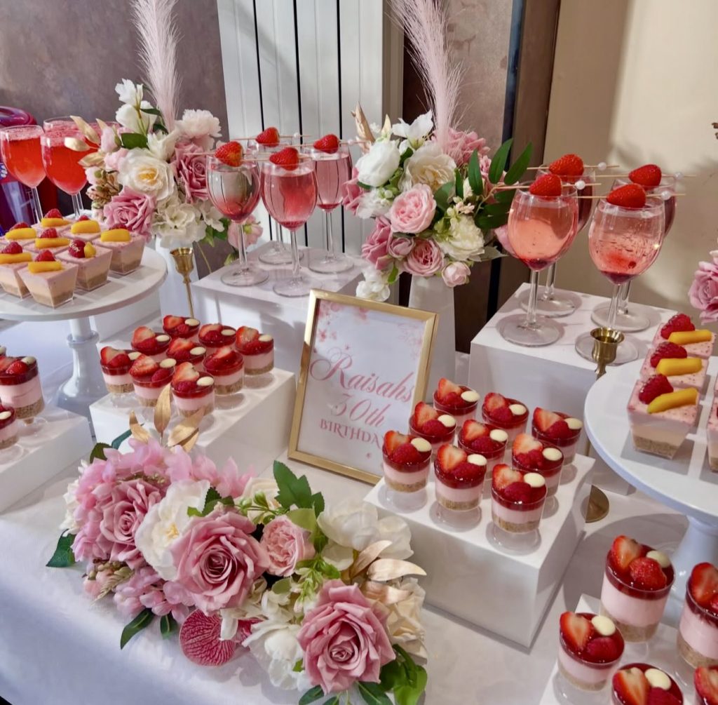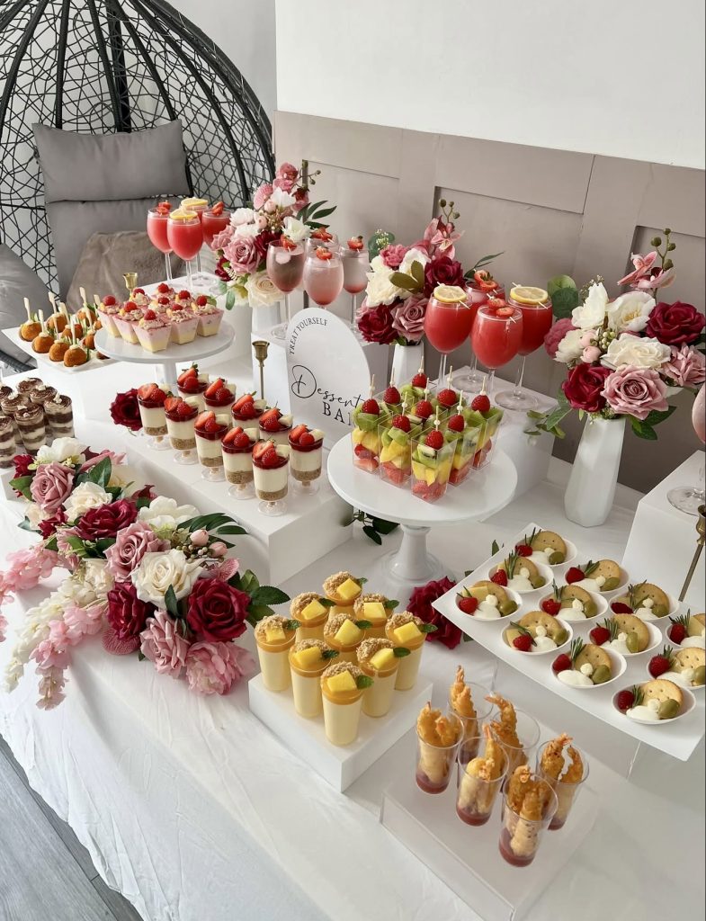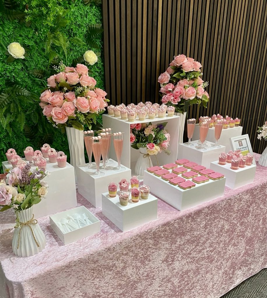 This design blends vivid pink florals with crisp white stands, creating a vibrant yet delicate dessert table ideal for a Sweet 16, bridal shower, birthday party, or even a whimsical safari or Bluey theme with a feminine twist. Strawberry-topped cups, mango mousse shots, and Oreo-inspired desserts provide color contrast and flavor variety—something modern stylists often emphasize when planning tables that cater to mixed age groups. The butterfly details add a subtle touch of fantasy without overshadowing the sophisticated floral centerpiece. Rich garden roses, wax flowers, and soft greenery make the whole setup feel like a boutique event planned by a professional, even though the structure remains wonderfully simple.