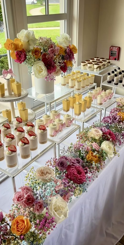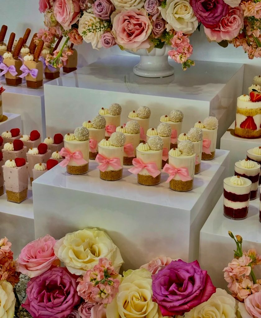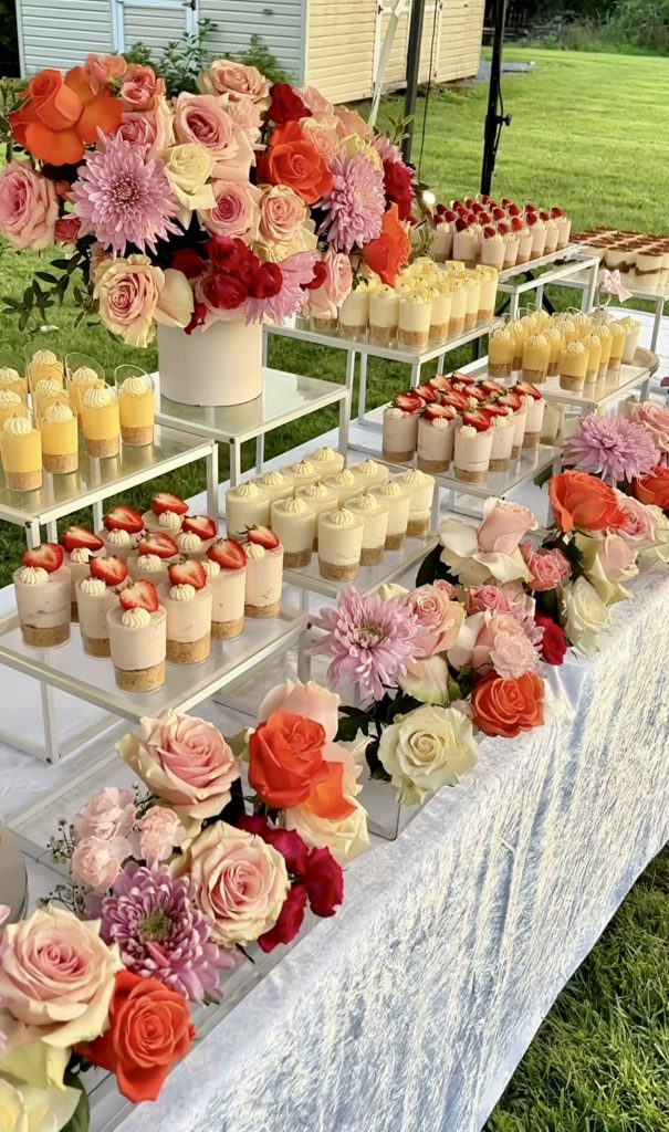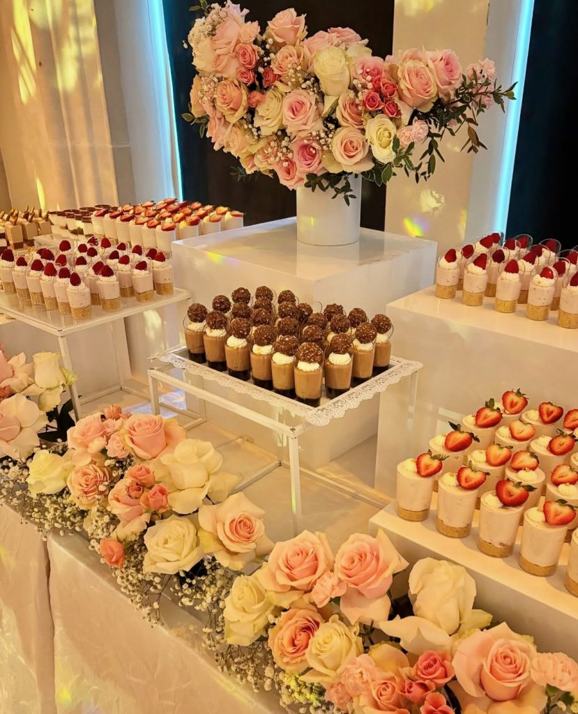 A lush, garden-style dessert table like this one is perfect for a birthday party, bridal shower, or even an elegant daytime wedding celebration, combining bright floral abundance with a clean, modern dessert layout. The bold mix of coral, pink, and cream roses paired with oversized chrysanthemums instantly elevates the setup, creating a romantic backdrop that feels both airy and luxurious. The multi-level stands keep the display simple yet visually dynamic, showcasing creamy mini cheesecakes, strawberry-topped parfaits, and light mousse cups that look effortless but polished—ideal for themes like Baby in Bloom, pink décor parties, or Sweet 16 events where feminine color palettes shine.