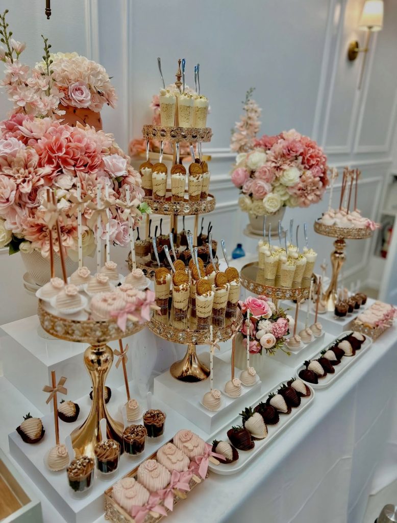This lavish blush-and-gold dessert table captures the luxurious feel that so many modern bridal showers and elegant wedding events are leaning toward in 2026. Soft pink florals frame tiers of mousse cups, dipped strawberries, cupcakes, and cake pops, all arranged on ornate gold stands that elevate even the simplest treat. The ribbon details and delicate textures give the table a refined, feminine identity while still feeling warm and inviting—a perfect choice for a Sweet 16, upscale birthday party, or a soft-romantic quince celebration where elegance truly sets the tone.