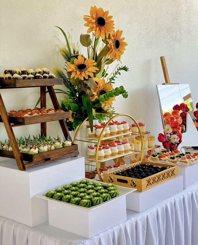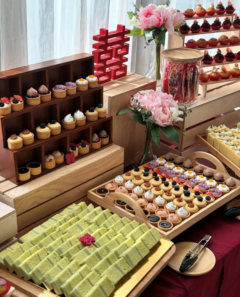 This bold and structured dessert setup embraces a modern Asian influence with its wooden tiered stands, vibrant florals, and precise arrangement of petite sweets. The layout feels ideal for cultural celebrations, engagement events, or a stylish grad party where color and craftsmanship take center stage. Mini tarts, mousse bites, and glistening cakes offer both variety and charm, while the warm wood tones add an organic balance that fits beautifully into the rising popularity of rustic yet contemporary dessert styling. It’s polished, abundant, and unmistakably memorable.
