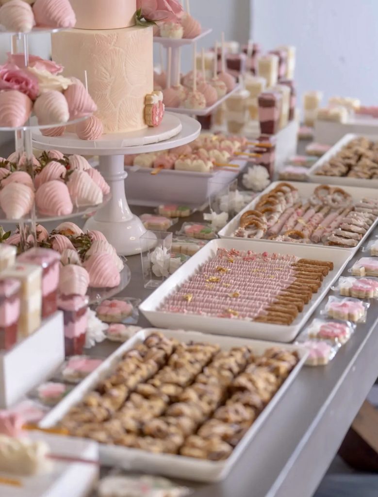 This soft, pastel-driven dessert layout features an inviting mix of dipped strawberries, pretzel rods, stacked cookies, and layered parfaits—an aesthetic that fits effortlessly into baby-in-bloom, bridal shower, or Hello Kitty-inspired parties. The neutral backdrop allows the pink tones to shine, creating a gentle and welcoming feel that aligns with 2026’s love for sweetness without excess. The abundance of trays filled with coordinated desserts gives the whole setup a buffet-style charm that’s perfect for larger gatherings where guests enjoy lingering and trying multiple treats.