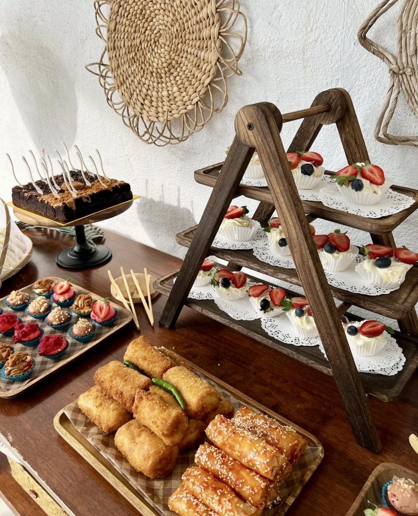 This rustic wooden dessert and snack table blends homestyle charm with effortless styling, making it perfect for outdoor birthdays, backyard parties, or cozy rustic wedding settings. The three-tier wooden stand filled with berry-topped treats pairs beautifully with the woven wall décor, creating a warm and natural atmosphere. The combination of baked goods, savory rolls, and mini bites offers a relaxed, simple, and approachable presentation that resonates with hosts who prefer unfussy setups that still feel thoughtful and beautifully curated.