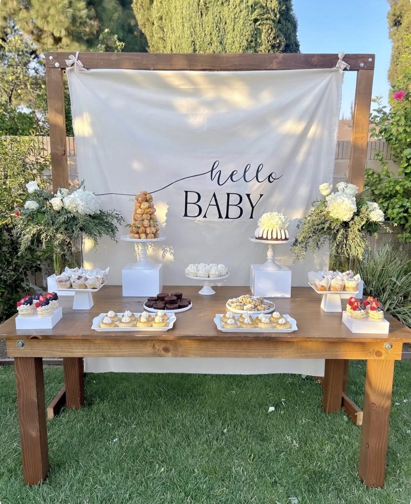This charming outdoor dessert arrangement feels perfect for a baby in bloom or baby shower boy theme, blending natural wood textures with creamy white desserts and garden greenery. The simple banner backdrop adds personality without overwhelming the table, allowing the petite pastries, brownies, and fruit-topped cups to shine. It’s a wonderfully simple and heartfelt idea for anyone hosting in their backyard—proof that you don’t need elaborate décor to create a warm, welcoming celebration.