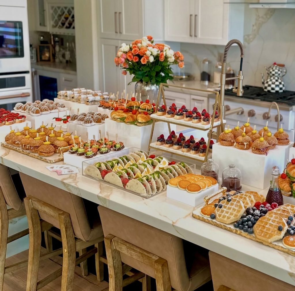 This abundant, brunch-inspired layout blends mini waffles, berry pastries, sliders, tacos, and iced desserts into a single cohesive display—perfect for a daytime graduation, a relaxed grad party, or a stylish birthday party setup. The marble countertop becomes part of the aesthetic, while the soft peach florals give a subtle nod toward rustic yet refined hosting. What makes this spread feel so 2026 is the balance between sweet and savory; guests love having options, and this table lets them browse freely without crowding. It’s a beautifully practical idea for hosts who want a table that feels upscale without losing its warm, family-friendly energy.