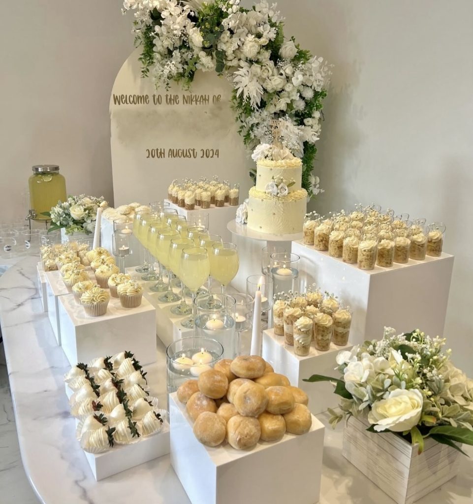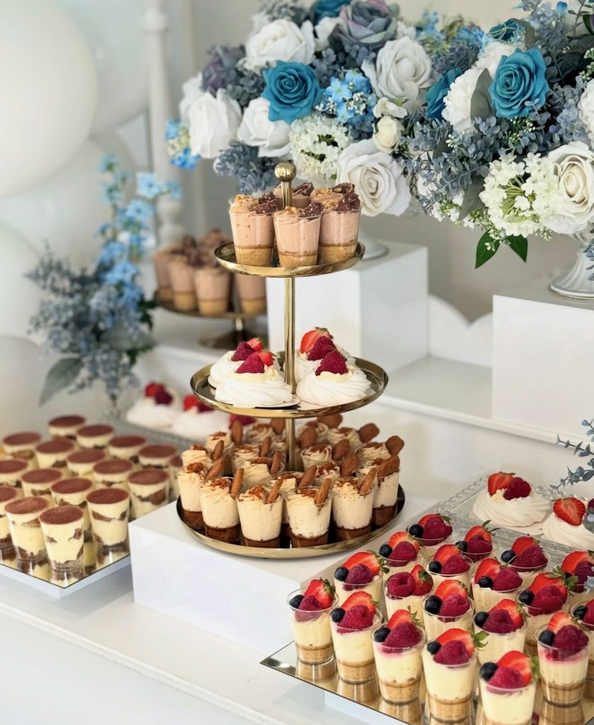 This refined blue-and-white dessert table delivers a sophisticated balance that suits elegant wedding, graduation, or classic bridal shower themes. Cool-toned florals frame an array of mousse cups, berry-topped parfaits, and piped meringues arranged on tiered gold stands that bring height and dimension to the display. The palette is soft yet striking, and the desserts offer a mix of creamy textures and fresh fruit that guests always appreciate. It’s a visually calming approach that feels both chic and timeless—perfect for events seeking a polished but understated aesthetic.