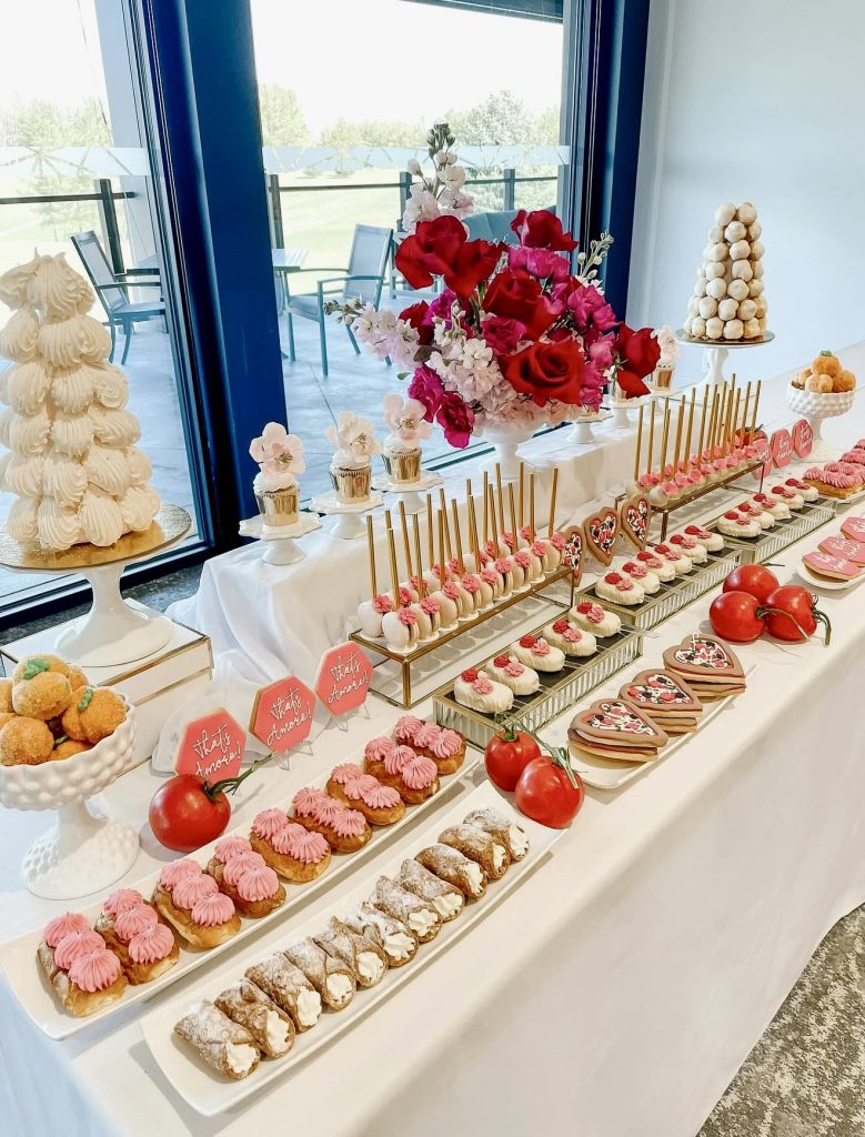This display feels like a joyful mix of romance and whimsy, perfect for a birthday party, bridal shower, or even a themed Sweet 16 thanks to its bold pink accents and polished layout. The macaron towers on each side bring height and instant sophistication, while the rows of heart cookies, cake pops, and cannoli make the table feel abundant and guest-friendly. Bright red roses and soft blush florals add a dramatic centerpiece that ties everything together, making it a great option for anyone planning an elegant wedding dessert moment or a decoration concept that needs a big visual impact without becoming overwhelming. The combination of structured symmetry and playful color gives the whole setup serious magazine-worthy energy.