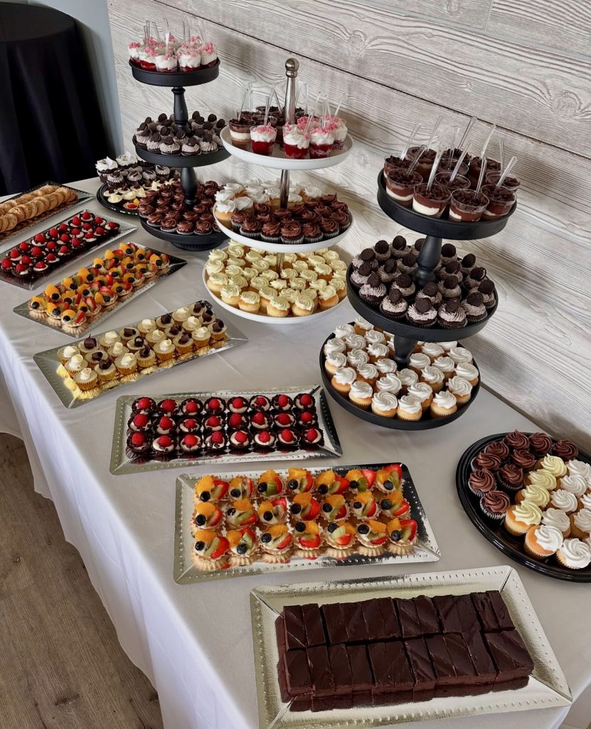 This spread has the comforting abundance of a traditional American party table, perfect for a graduation, grad party, office celebration, or family-style birthday event where guests love variety. The tiered black stands give the setup a polished, modern look while showcasing mini trifles, chocolate mousse cups, and cupcake assortments in both vanilla and dark chocolate. What really elevates the table is the balance between rich, indulgent desserts and bright fruit and tartlets topped with fresh berries and citrus slices. It’s the kind of display that feels both generous and welcoming, ideal for hosts who want that easy “take one of everything” experience. The simple layout works great for DIY decorators sticking to a tight timeline.