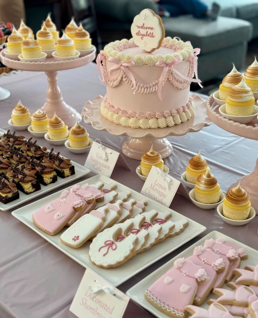 Soft pastels and vintage piping details define this charming setup, perfect for a baby shower boy twist, an elegant wedding brunch, or a cozy Winnie the Pooh-inspired gathering. The centerpiece cake—with its delicate ribbons and scalloped textures—anchors the entire table, surrounded by mini lemon cheesecakes and iced cookies shaped like baby accessories. It’s a style that resonates strongly with American hosts who adore sentimental touches, mixing homemade warmth with professional polish. The palette stays soft, white, and pink, making it a timeless choice for anyone wanting a dessert table that feels sweet, emotional, and full of personality.