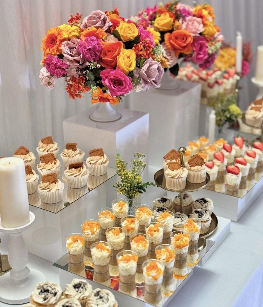 Bold florals and bright citrus-inspired desserts make this table a standout choice for spring and summer birthday party themes, cheerful bridal shower gatherings, or colorful wedding receptions that embrace maximalist blooms. The arrangement of gerberas, roses, and hypericum berries creates a lively focal point, while mirrored trays and gold-accent pedestals add structure and shine. Mini cups filled with orange cream, Biscoff-topped cupcakes, and berry parfaits bring both color and cohesion, striking that perfect balance between playful and elegant. This design also fits beautifully into modern rustic wedding décor, where pops of color breathe life into otherwise neutral spaces.