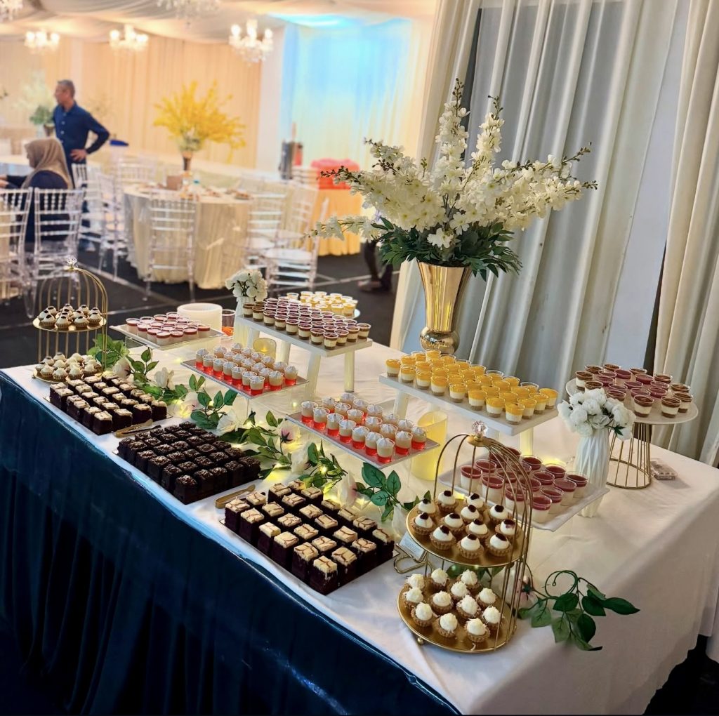 This elegant tiered dessert arrangement blends petite cakes, pudding cups, and layered mousses into a polished setup ideal for elegant wedding receptions, corporate galas, or upscale graduation party gatherings. The warm gold accents paired with soft greenery and white florals create an inviting yet refined tone, proving how powerful neutral palettes can be when styled thoughtfully. It’s a timeless approach that works well for large venues because it keeps desserts organized, visually accessible, and beautifully cohesive without feeling overly ornate.