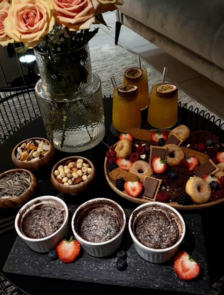 This intimate, cozy spread shows how dessert tables in 2026 can be scaled down for relaxed gatherings—perfect for a small birthday party, movie night, or casual friends-and-family celebration. Rich chocolate soufflés dusted with sugar, paired with bowls of nuts, seeds, and a colorful grazing board full of berries and mini treats, create a comfortable and inviting mood. The warm lighting and rustic wooden accents make the entire layout feel personal and unfussy, proving that dessert styling doesn’t always need formal stands or structured tiers to feel thoughtful and beautifully arranged.