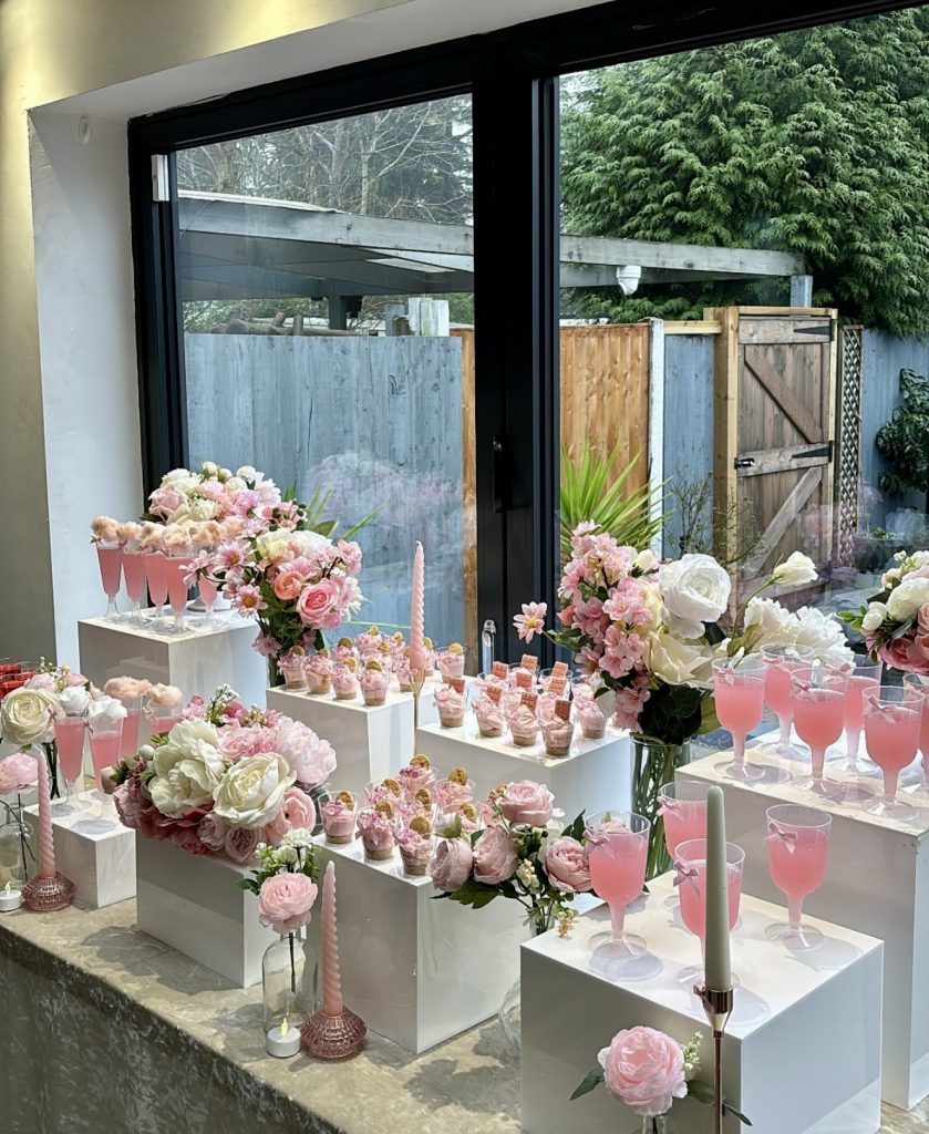 This soft, romantic spread leans into the airy charm of fresh florals and pastel tones, making it perfect for a bridal shower, quince, or baby-in-bloom party. A mix of pink beverages, mousse cups, and petite treats sits atop structured white risers, giving every dessert its own moment without overcrowding the table. What makes this design feel especially 2026 are the balanced layers of florals and candles—subtle décor touches that elevate a simple layout into a dreamy focal point guests will remember long after the celebration is over.