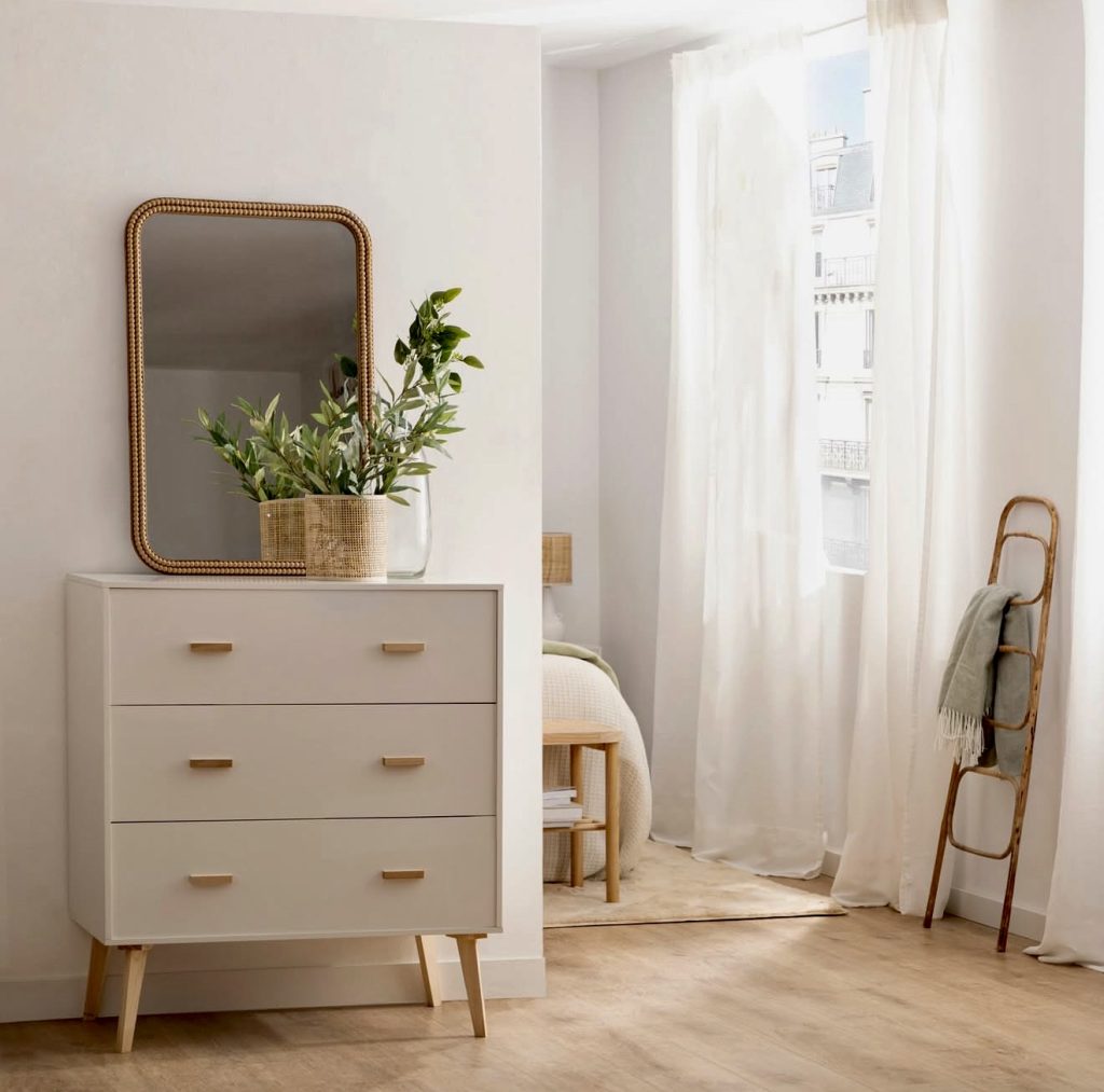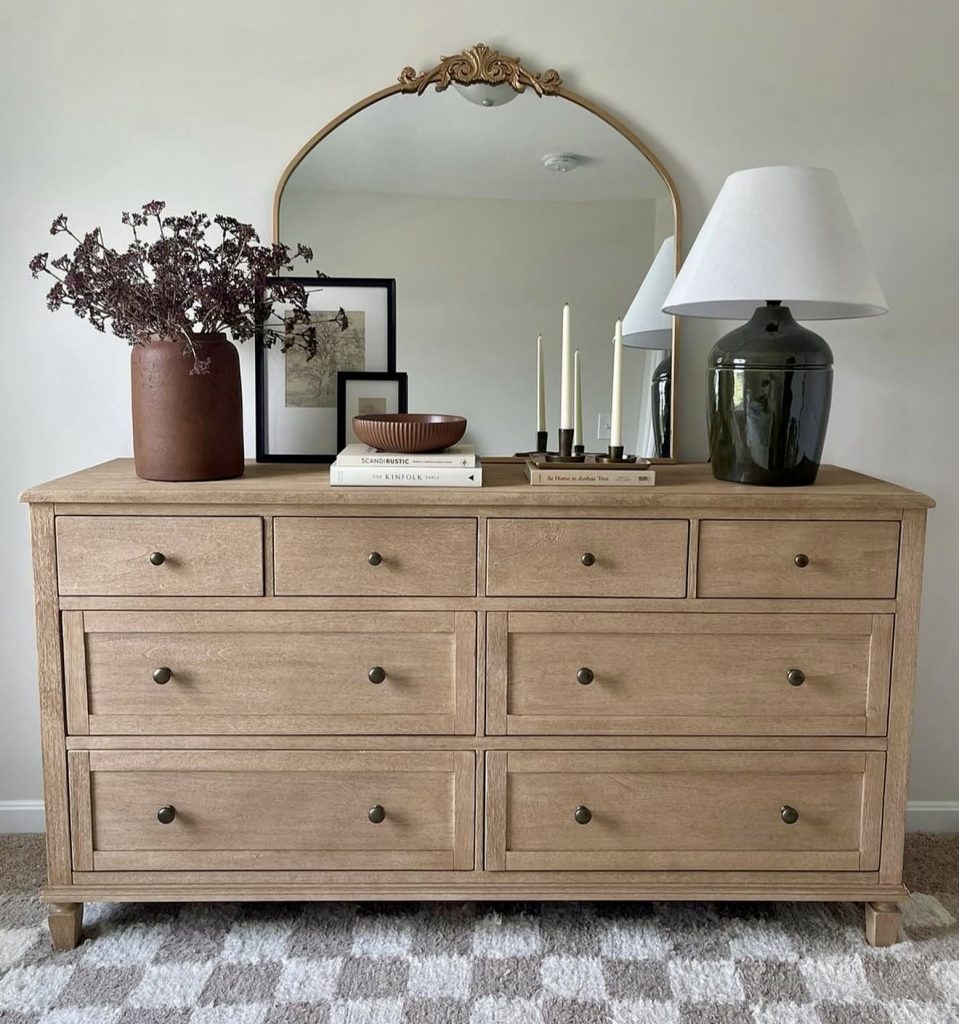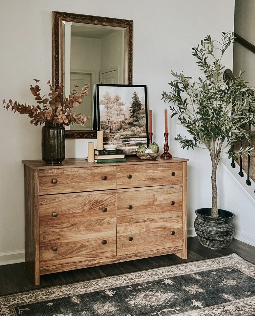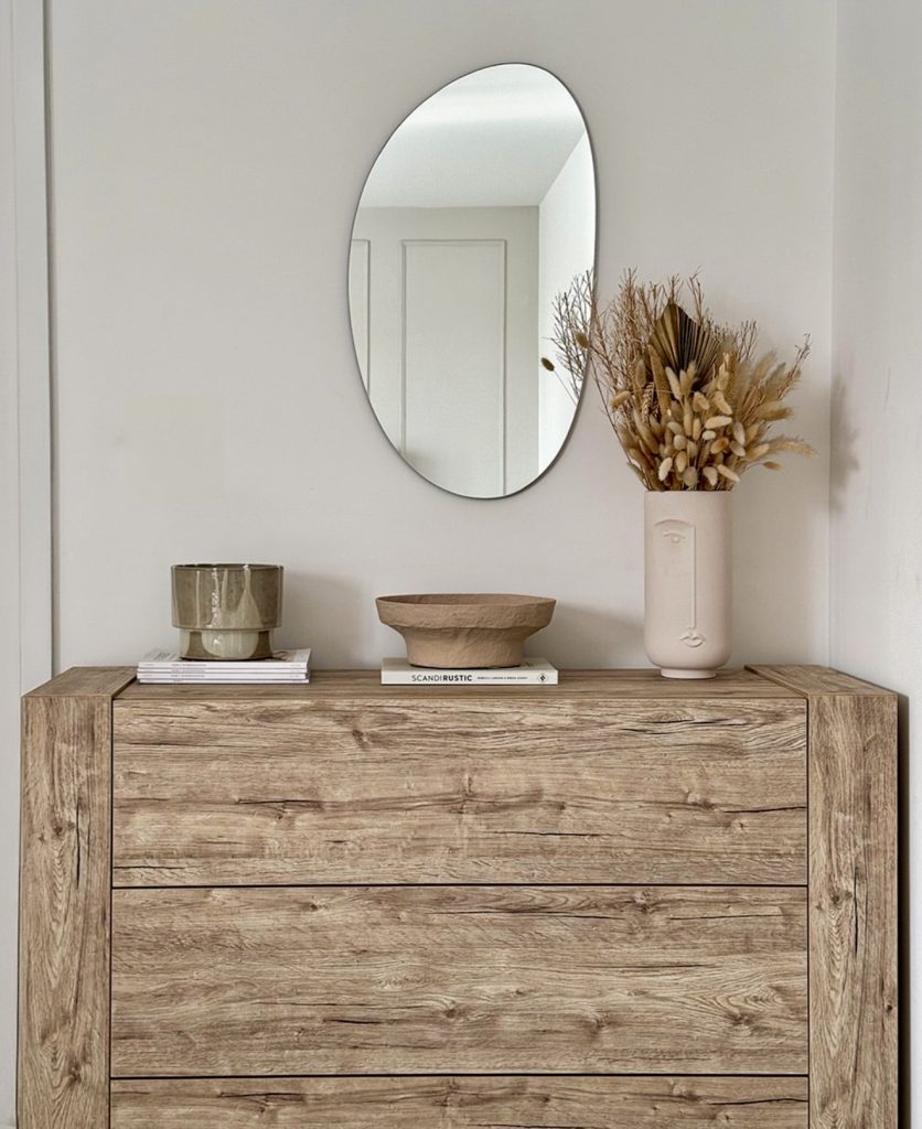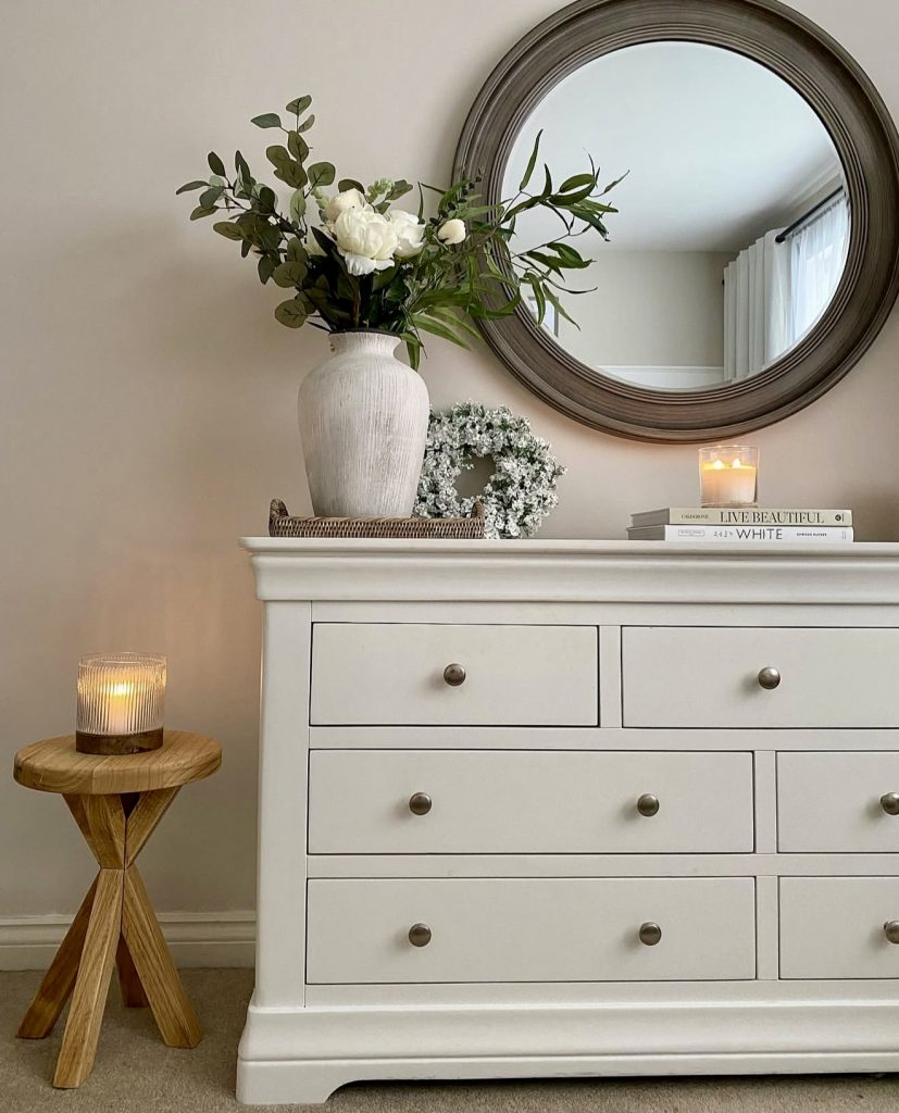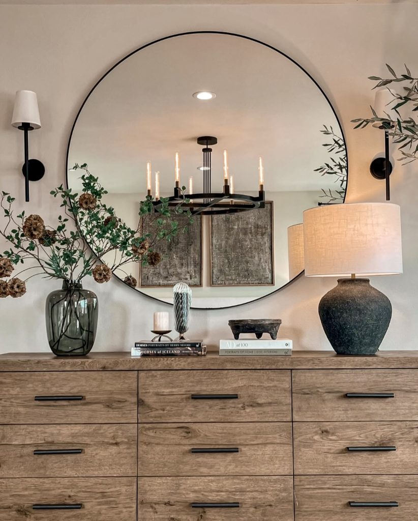 Creating a display on top of a dresser has actually emerged as one of the easiest and most dramatic ways to accomplish this. In 2026, dresser decoration must incorporate a balance of approaches to bedroom decoration that are both layered and aesthetic. In this case, a display begins and ends with a focal point in a large circular mirrored wall decoration that has a noticeable presence in a room. The wooden finish of this dresser brings a natural warmth to this display that needs to balance a large mirrored display with enough decoration to layer and add some interest. The addition of some plants in a glass display and some mixed decorative displays will provide some interest to this display.