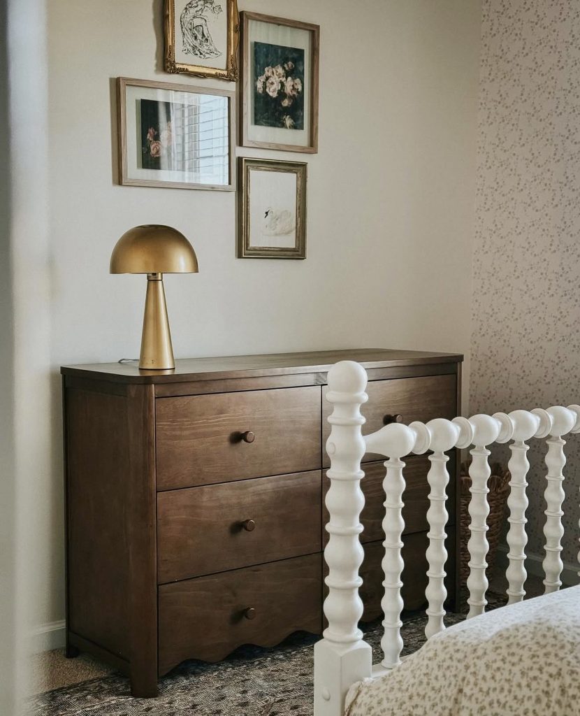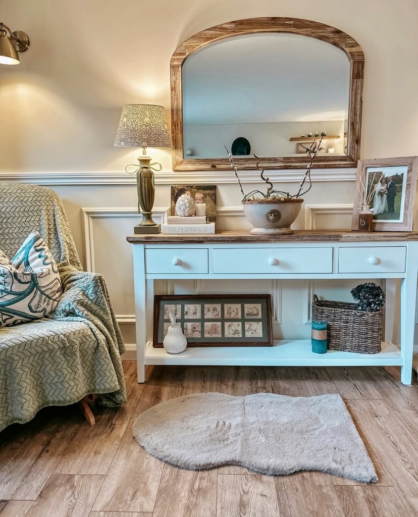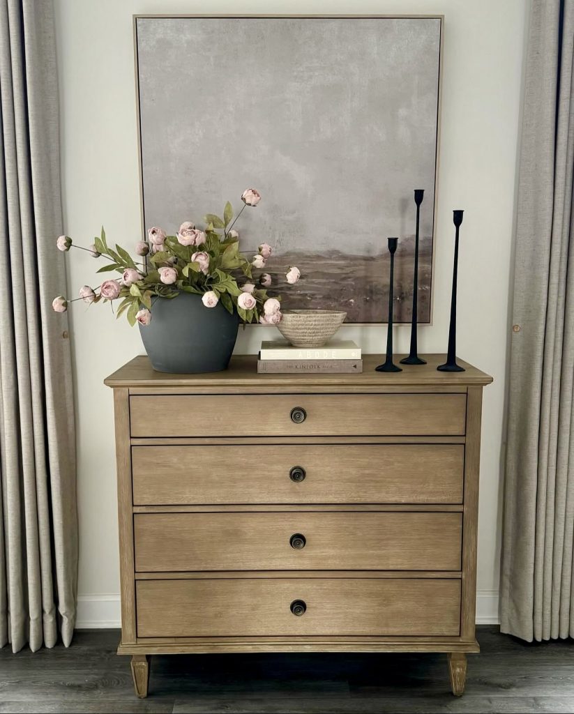The above is a perfectly cozy space designed in a farmhouse theme and exudes a level of comfort. The natural wooden top and painted base of this dresser ensure a perfect balance between its natural and polished looks. The soft glow of a table lamp is a common sight in a perfectly designed and cozy space like this. The framed photographs and natural elements like a bowl made of ceramics and books wrapped in linen are all common features in well-designed spaces that have a deep connection to a specific theme. The whole design is a lesson in how a space can sometimes symbolize a nostalgic theme in a perfectly designed and relevant style for 2026.