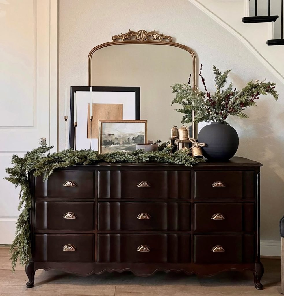 In this setup, a deep dark-wooded base with seashell-shaped brass knobs is enhanced by the placement of a golden antique-style mirror above. The placement of greens above this dresser is a symbol of a fun-filled Christmas and is perfectly suitable for a country-style bedding setup. As if to add more to this fun and playful setup, some layered art is left casually against this antique-style mirror. The dark-colored vase filled with a few winter branches completes this setup and shows that this fun and playful level of Christmas decoration is perfectly suitable for a country-style bedding setup. The beauty and magic of this setup lies in its simplicity.