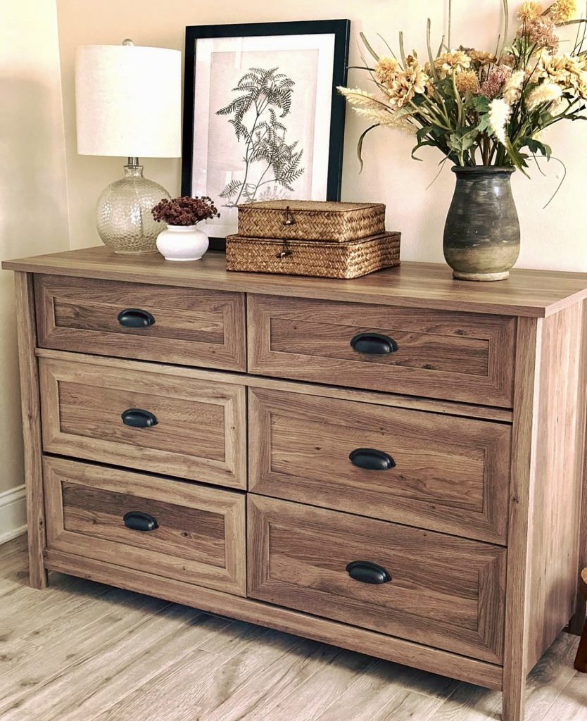 The beauty of natural textures is brought out in this dresser. The medium woods are a natural color and have some fun black hardware. There are woven and natural vases placed atop this dresser. The addition of a white and clear-topped glass table lamp as well as some framed and hung botanical prints shows that this is a setup that is right for a country-style bedroom as well as a western-themed one since it shows how to add natural and elegant textures in one decoration.