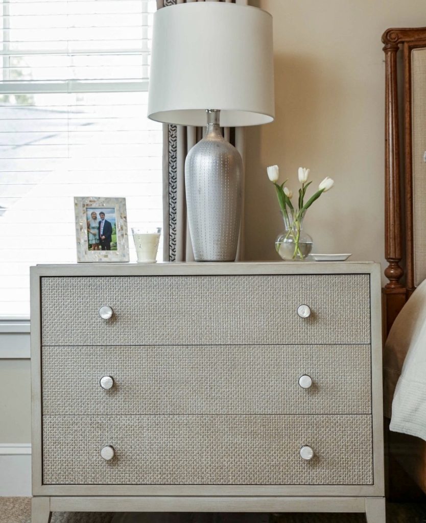The decorating style of this dresser is one that is right for a contemporary and sleek bedroom. The white woods have a fun and different texture to them as well as round and metallic knobs. There is a tall and metallic silver table lamp. On top of a dresser, a photograph in a frame and a vase of fresh tulips add a personal touch. Such a simple arrangement is ideal for a master retreat. It shows that even when you have fewer elements, you can still achieve a look that is meaningful and timeless.