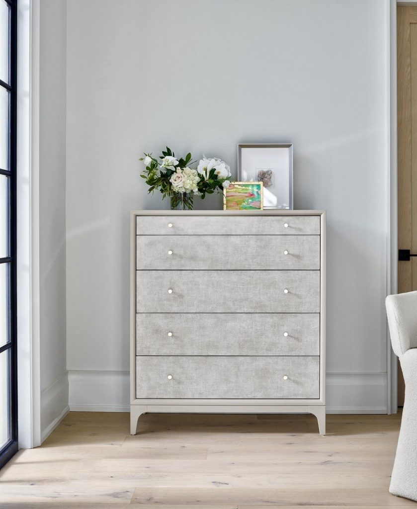 Simple and artful, this dresser shows how some decorating styling can go a long way. The light woods have a touch of texture to them, while a sculptural vase filled with white flowers rests atop this dresser. The end effect is a fresh and modern look for a bedroom.