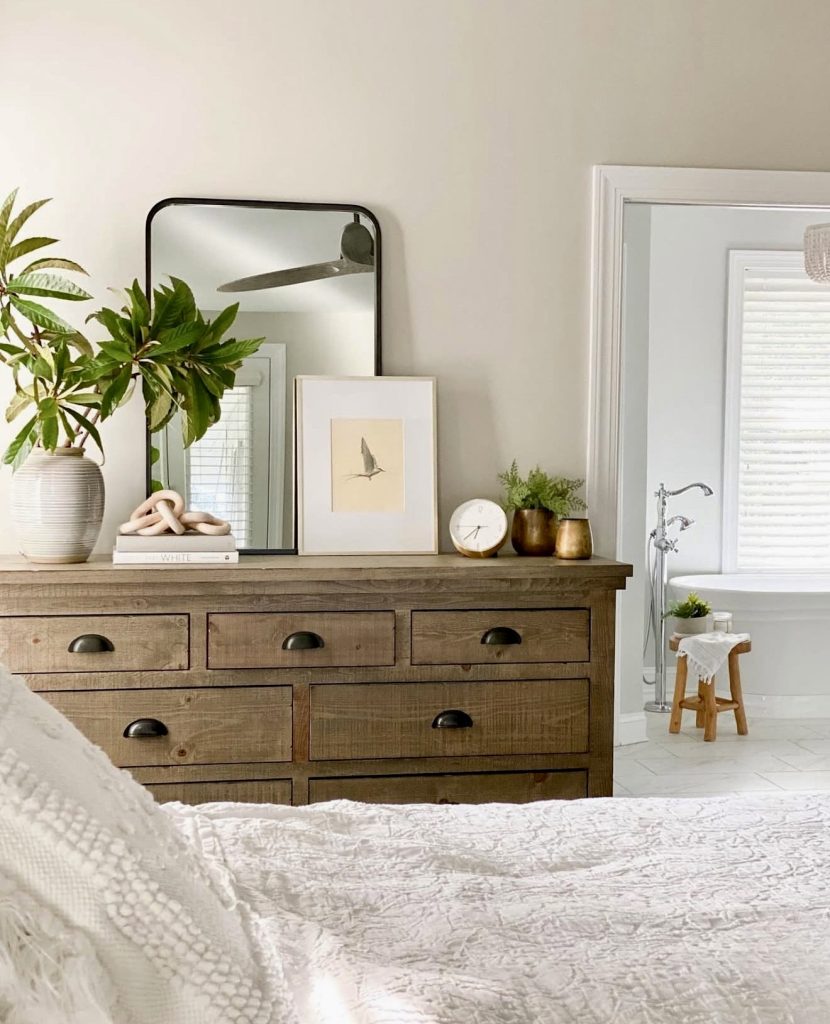 In this setting, a natural wood dresser pairs with a natural and earthy feel in a neutral-colored room. The neutral colors and table lamps emit a positive vibe for a modern farmhouse-style bedroom. However, to add balance and a touch of elegance to this setting, a wooden dresser and wooden-framed wall art are placed atop a console table. In this scenario, a natural wooden console table and natural wooden wall art are a perfect example of how wooden furniture can define a bedroom in a more sophisticated and elegant way in a modern setting like 2026.