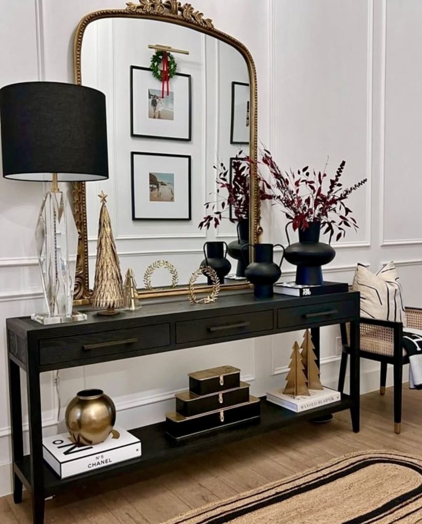 In this scenario, a console table in black is paired with a golden floor-to-ceiling full-length mirror above. To add some contrast to this scenario and make it more balanced and elegant, a white and black vase and some golden decorative objects are placed on either side of a console table. The white and black vase and some golden decorative objects placed in this scenario are a perfect example of how white and black colors and golden objects can define a console table in an elegant and sophisticated manner in a modern scenario like 2026.