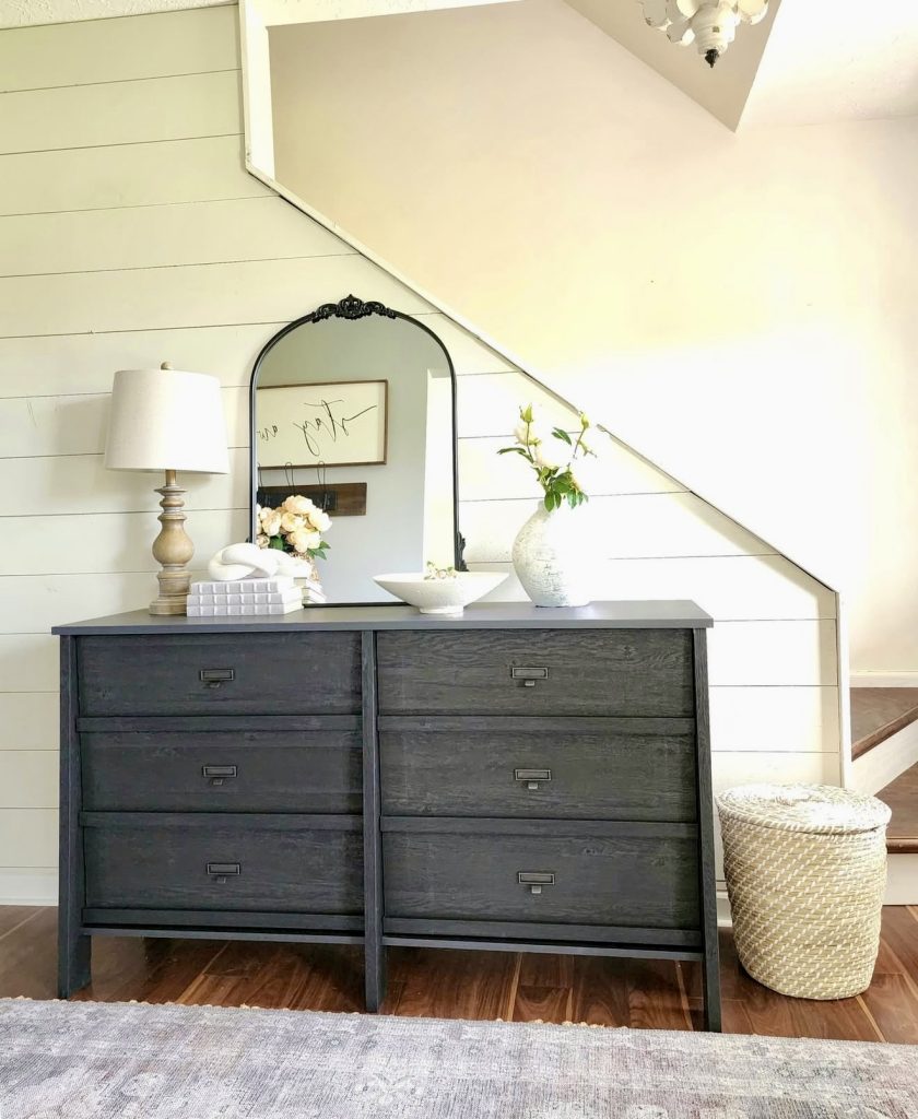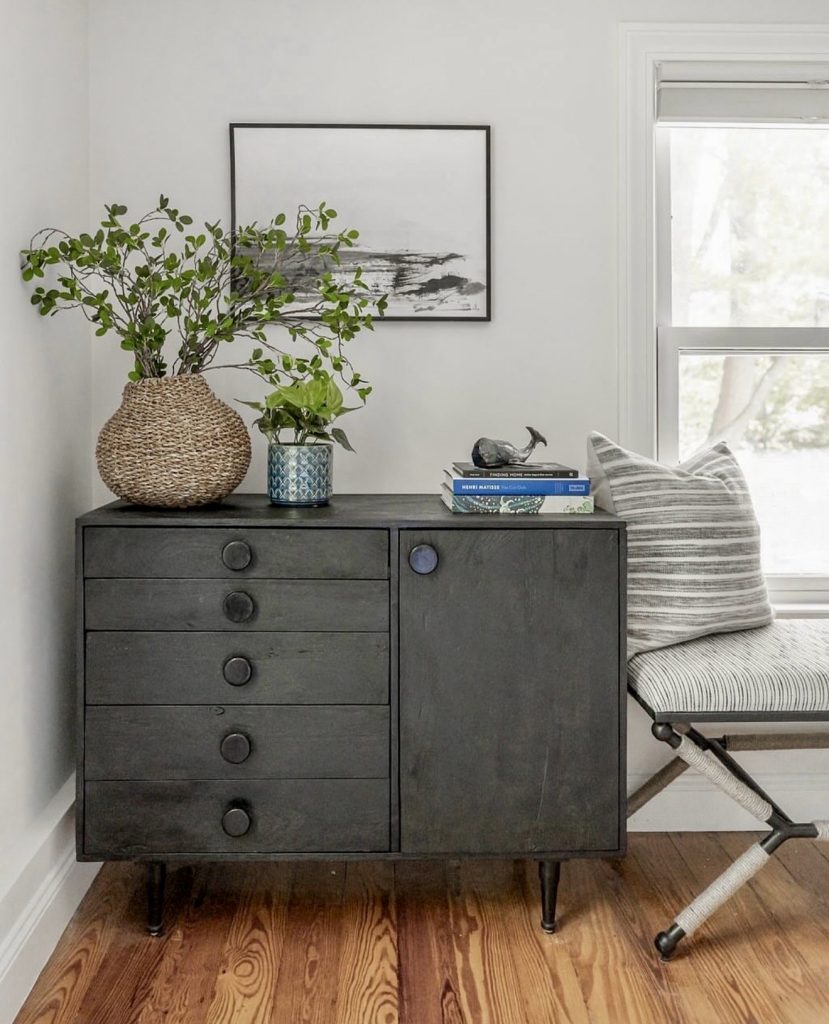 The fifth display is one that shows that not all dark-colored furniture is old and outdated. In this display, a black dresser with a golden handle is prominently featured. The display is designed to have a sophisticated theme that will please those looking for some inspiration that features a touch of antique and western in its interior designs. The display is completed through a table lamp placed above a table with some art that displays its beauty. Moreover, a tall vase filled with greens completes this display. The display is not that old and hence suitable for many people as inspiration for interior designs. Great for a master retreat and even a bohemian bedroom where contrast is a must, this design example displays how a dresser can not only add some much-needed personality but also still have some fun functionality. If you’re looking for some design inspiration to give your dark furniture a more modern twist, this is a lesson in balance.