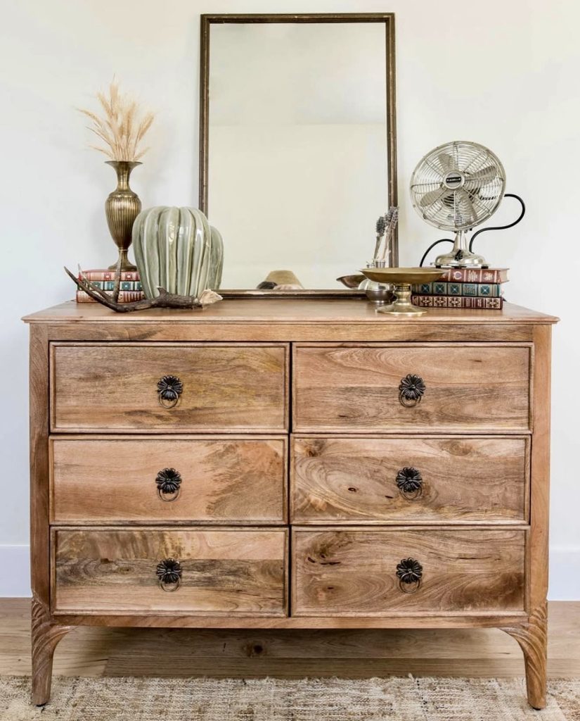 The above antique dresser exudes a classic beauty that is a mix of both craftsmanship and a touch of retro philosophy. Its wooden finish and brass knobs exude a lived-in luxury. The tabletop decoration is a mix of old books and vases made of brass and a green sculptural table lamp that exudes a touch of classy elegance inspired by woods in a more distant land. The above decoration is a mix of different cultures and a more ancient past that can easily define a bohemian-style master bedroom that is just as antique and soulful. The above is a one-of-a-kind antique dresser that has a personality all its own that comes from different objects that are all pre-owned.